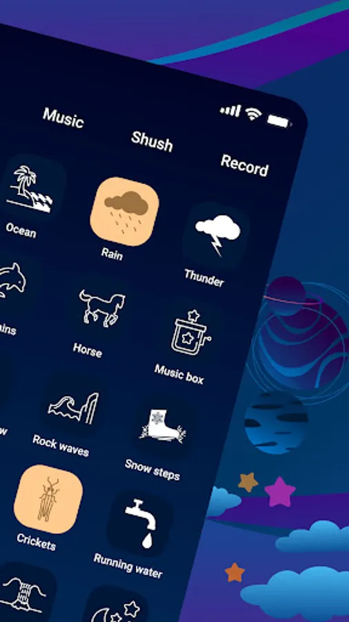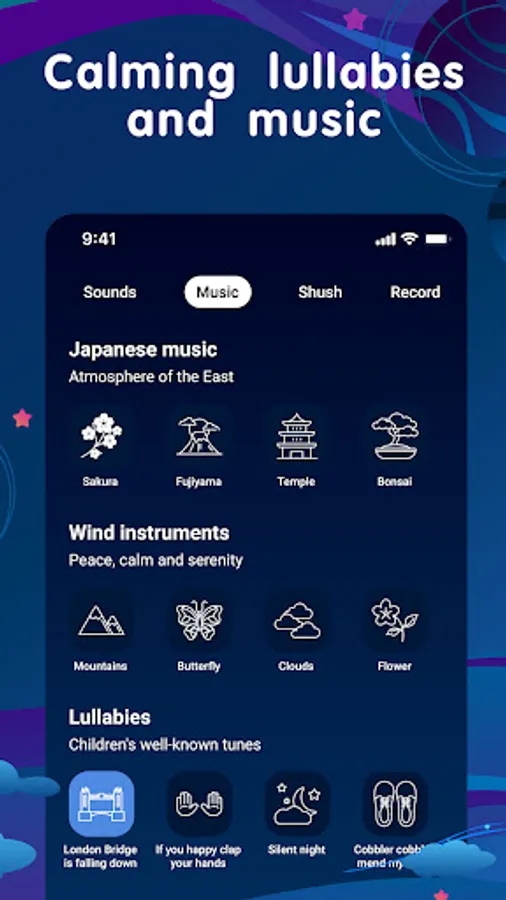 In our baby noise maker app you will find soothing music for sleeping of different genre: Classical music, Space music, Celtic music, Spanish music, Japanese music, and lullaby music.