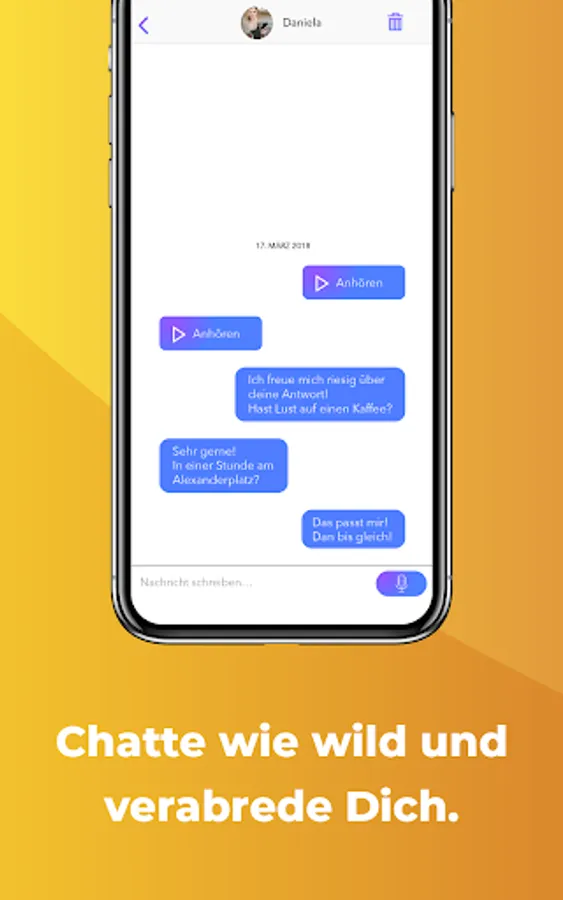Send creative, charming or funny voice messages. You're the shy guy? Of course, chatting is also possible! Expand your profile and show more of you. Upload pictures or record a new audio profile.