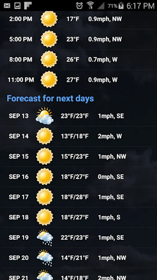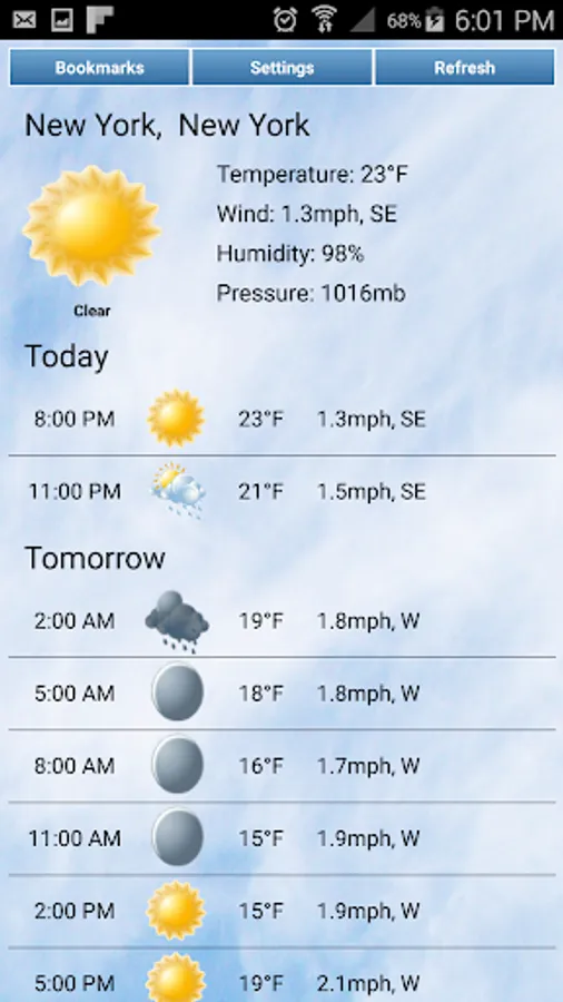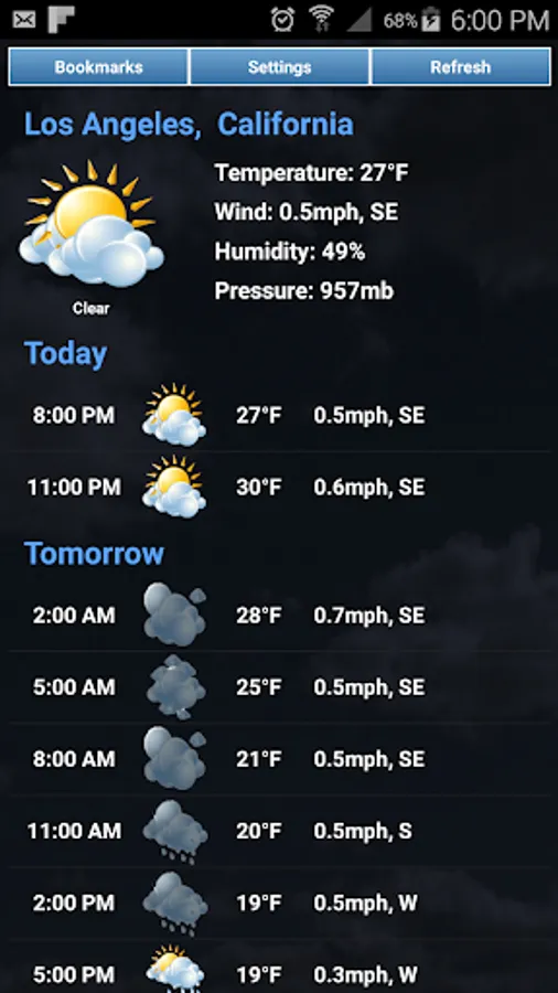 The application "Local weather USA" gives us the overview of weather data for about 25000 towns from the United States of America.There is current weather information, as well as a weakly weather forcast. Forecast for the upcoming 3 days is very detailed.