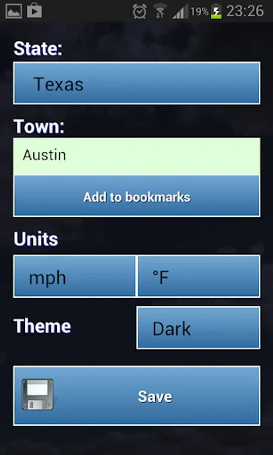 The application gives us data about temperature, humidity, speed and direction of wind. We can choose between different units. Locations we are interested in can be added as bookmarks. Aplication gets data from OpenWeatherMap.