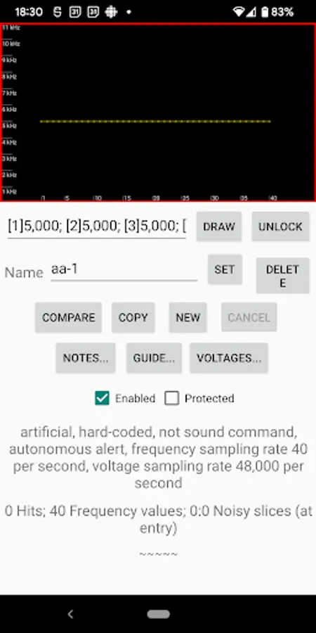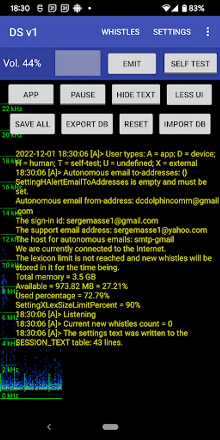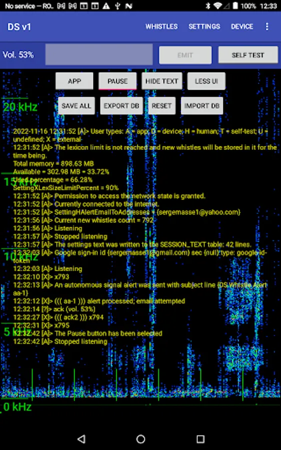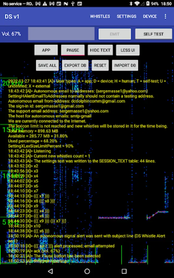 The app also works like a chat or text messaging application but using whistles: it emits and recognizes whistles. When the app recognizes a whistle that it already has in its lexicon, it surrounds its name or number by ((( ))), such as ((( hello ))) or ((( 147 ))) and ((( x123 ))). When the app does not recognize a sound as a known whistle, it gives it a number and displays that number without the ((( ))), such as x123. To emit one or more whistles, you type their names or numbers in the edit text box and select the Emit button. After an emission you may repeat it by selecting the Repeat button.