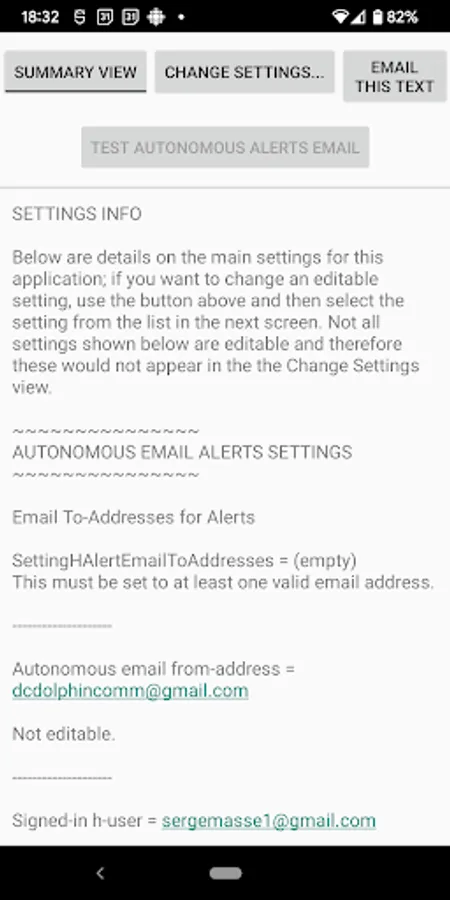 One or more destination email addresses must be entered in setting SettingHAlertEmailToAddresses for autonomous emails to be operational. You get to it via menu option SETTINGS > button CHANGE SETTINGS... > touch "Email To-Addresses For Alerts".