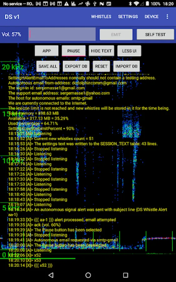 This app, DS, has specific features to help monitor the well being of dolphins in a sanctuary or in a frequented area at sea. It can run autonomously for days and can send emails to staff when certain whistles defined by you are detected.