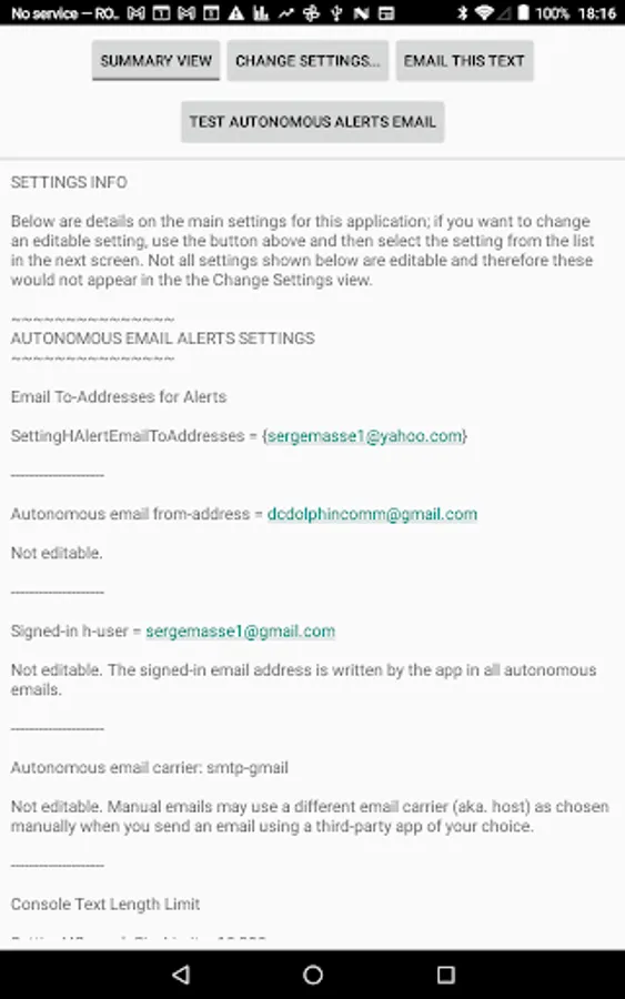 There is another button in the first SETTINGS screen for testing autonomous emails. Just touching it will trigger the test email.