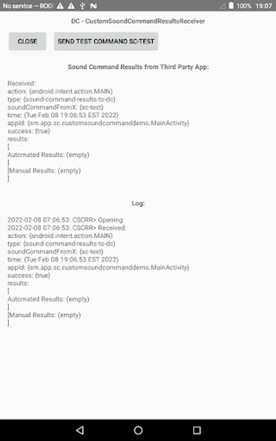 the transmission of the command (sc-test) to CustomSoundCommandDemo;