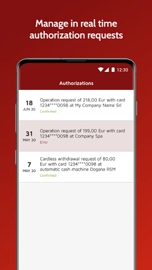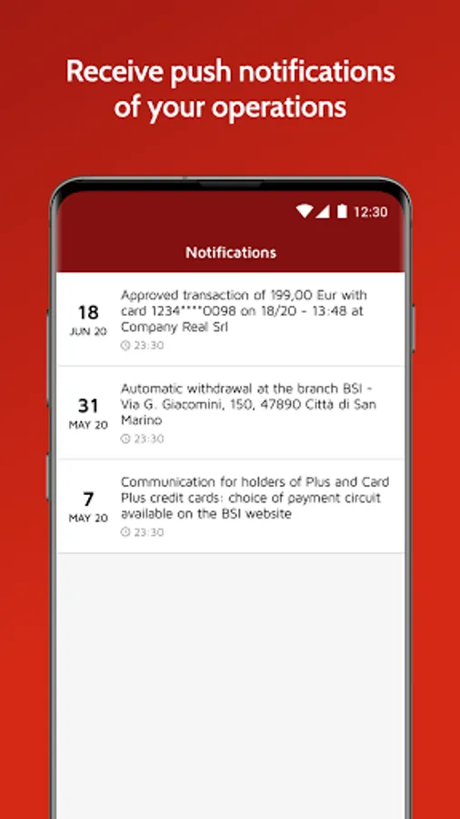 You can receive real time authorization notifications from the bank to login the Web Banking service or to complete an e-commerce payment with your credit card. You can confirm the authorization notifications using a security PIN or using digital print technology or facial recognition technology if allowed by your device