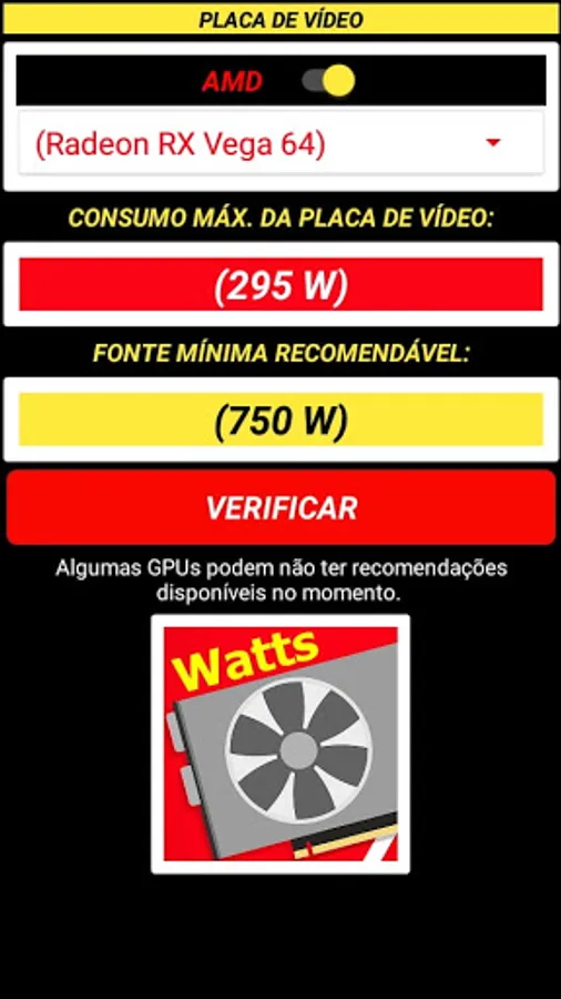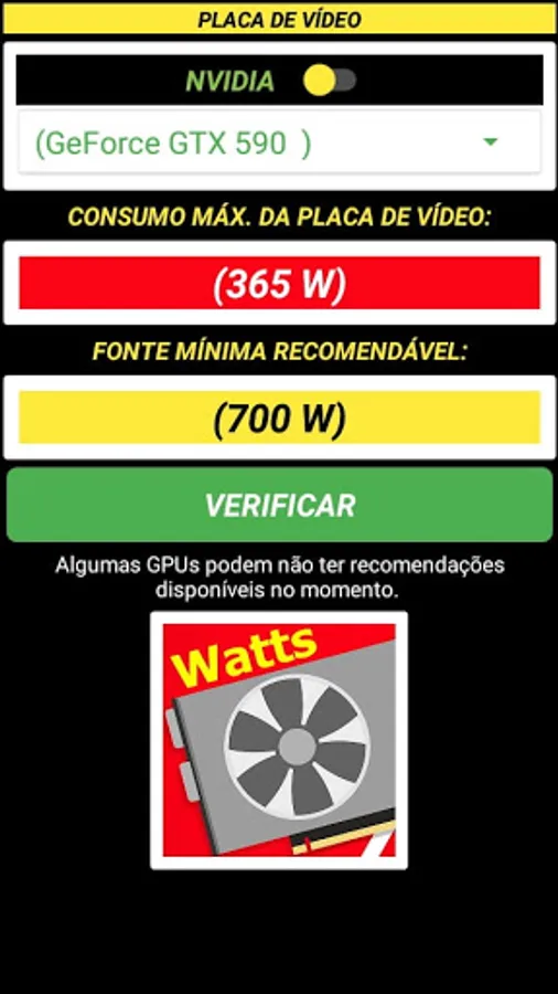 The Application shows you how many watts (energy) your video card (GPU) uses to work and even makes the minimum necessary power supply recommendation (watts).