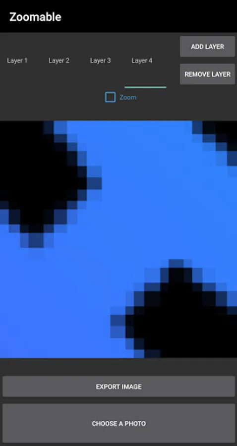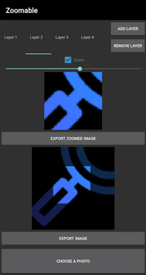 each of the Image Views in the Zoom View can be saved to Pictures/Zoomable under the android external storage root by tapping the Export Main Image and Export Zoomable Image button underneath the appropriate view