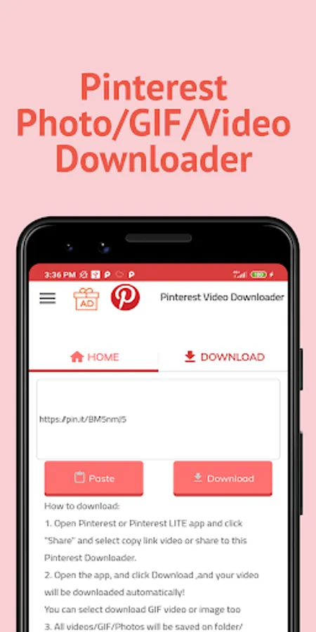 4. Then you paste the copied link in the search box of "Pinterest Video Save" app, then click on the download button.