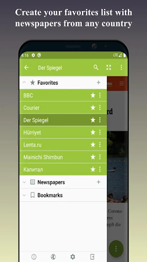 ● Favorites to add news sites from any country to your preferred list