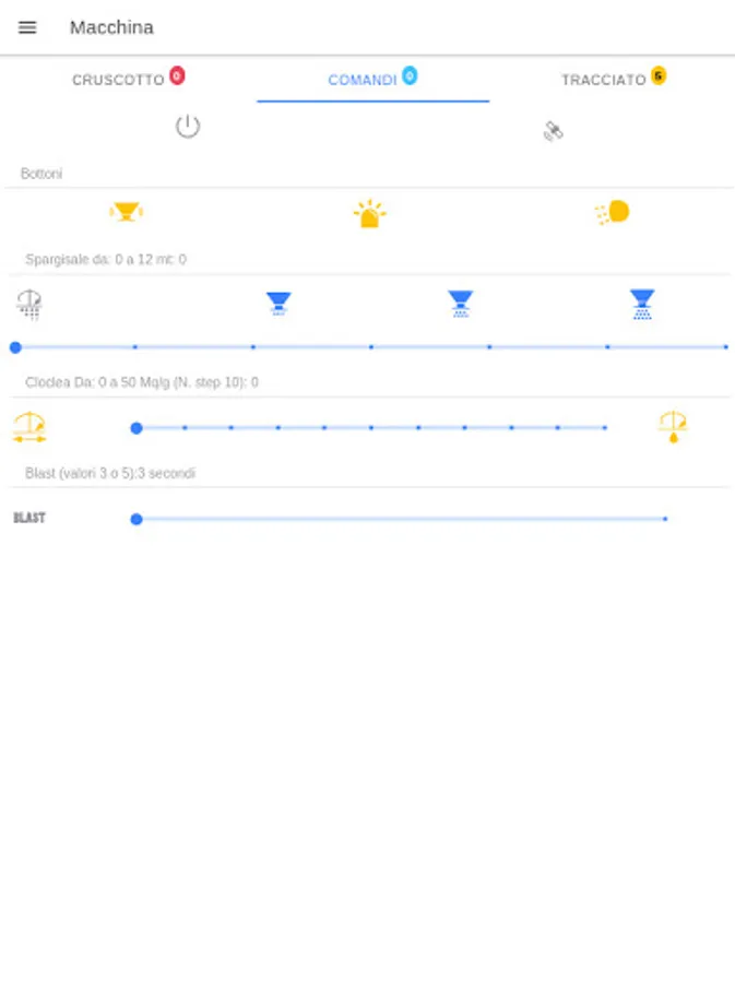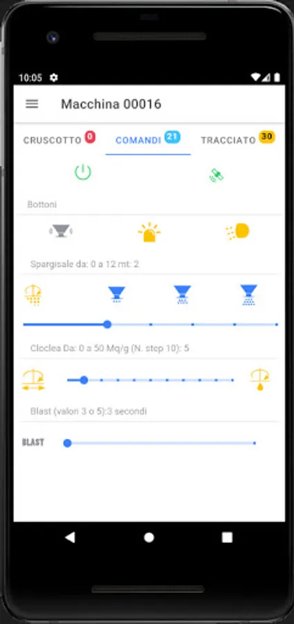 With the application you can control our salt spreading machines directly from your mobile phone. You will have the possibility to turn on the lights, the flashing lights, the vibration, activate the auger and disc by choosing the speed. At the same time you will be informed of the status of the machine you are driving thanks to the information that sensors send to the application constantly.
