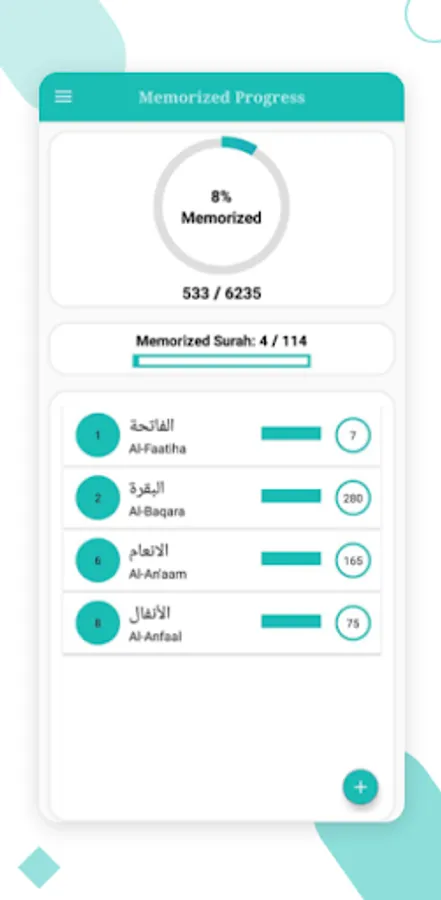 Memorized Progress - Memorized progress helps to check how many surahs are memorized. It will track your memorization progress.