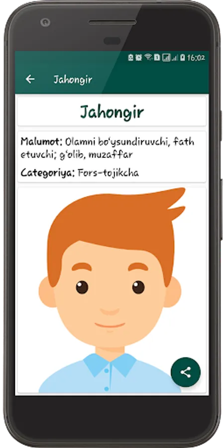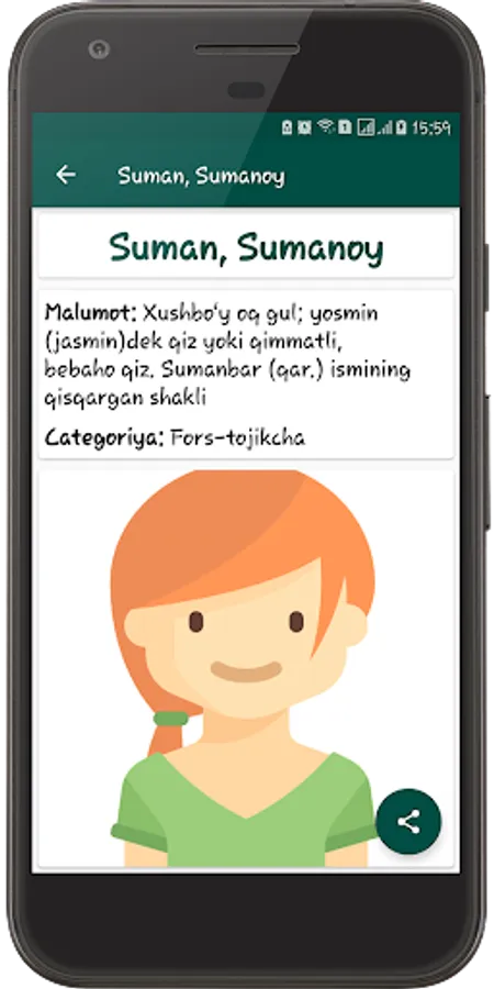 Ushbu dasturda 15,000 -dan ziyod ismlar manosibilan Lotincha va Uzbekcha namudlarida keltirilgan. Bundan tashqari siz bu dasturdan Uzbek, Tojik, Fors va Arab tillaridagi barcha ismlarni to'liq sharhi bilan ma'lumot olishingiz mumkin. Qidirish dasturi juda sodda bo'lim siz unda Qizlar yo O'g'ilbollar bilan yoki alfavit orqali qidirishingiz ham mumkin.
