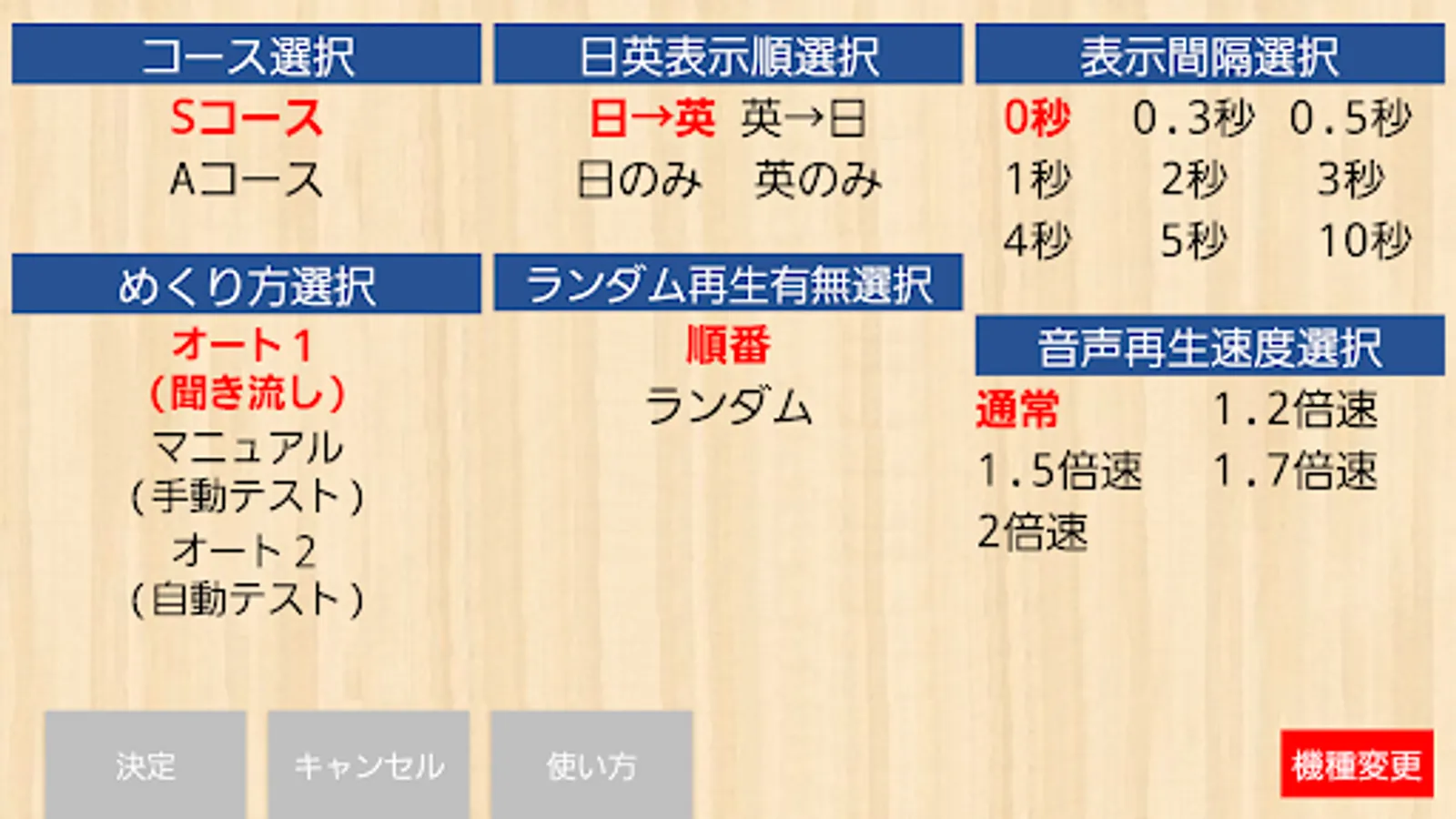 ・The interval between Japanese and English can be freely set from 0 to 10 seconds. If you can start with about 3 seconds and eventually be able to say it in 0 seconds, you are pretty close to speaking fluently. (3) Card automatic test function (turning method = auto 2)