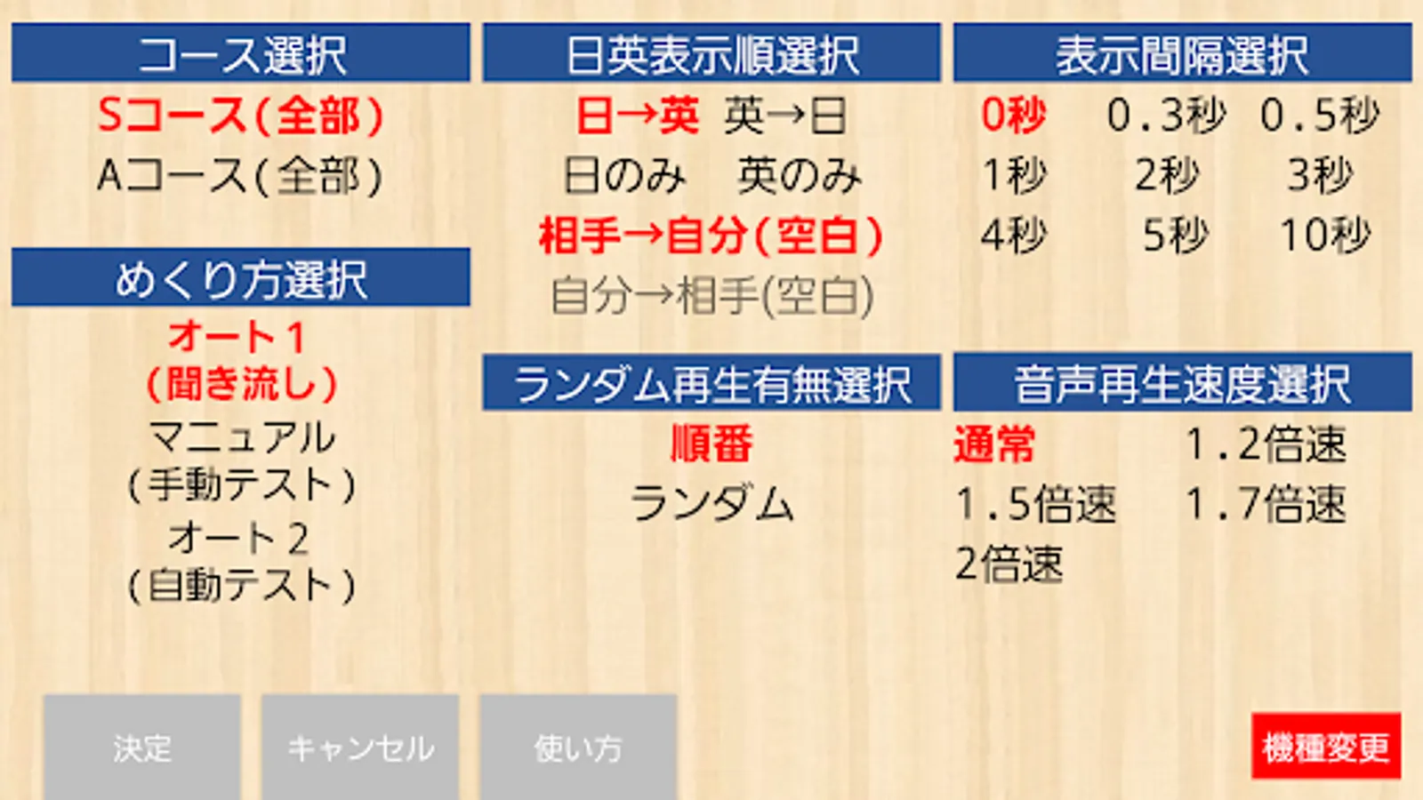 ・The interval between Japanese and English can be freely set from 0 to 10 seconds. If you can start with about 3 seconds and eventually be able to say it in 0 seconds, you are pretty close to speaking fluently. (3) Card automatic test function (turning method = auto 2)