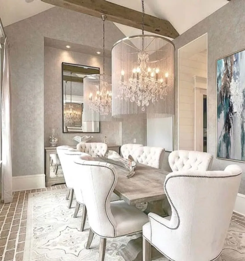 One of the coolest things about this living room is the casual yet elegant looking chandelier. It may seem simple, but if you look at the lighting treatment in this house, you will be convinced that this house stands for glamour and luxury. Note the spectacular console and central table that add drama to this neutral-hued home. The details are made especially for these homes, such as the white walls, white chairs, and white tables and chairs.