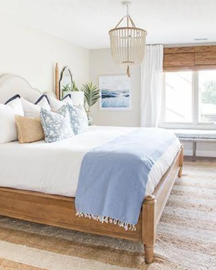 The different textures of pillows, blankets, and rugs make the design special, and the different colors of chunky knits and warm woolen knits work well in this room.