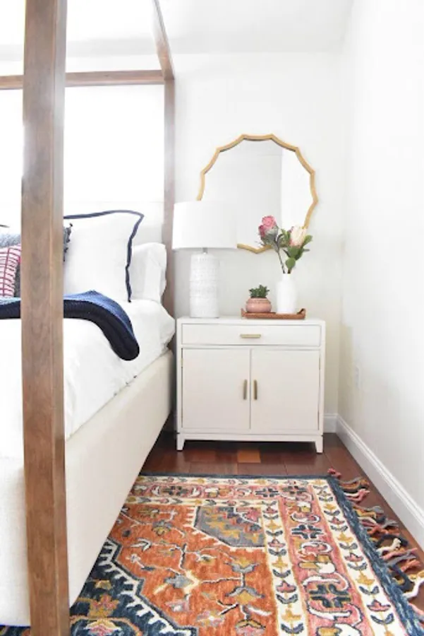 The elegant black wood is used for the bedside table and bed base, and the matching duvet and curtains with fresh flowers are a great combination to balance out the white furniture. The white linens, which are paired with grey throw-ins, are chic and minimal, while the splash of color across the entire back wall of this stylish bedroom adds a cheeky splash of color.