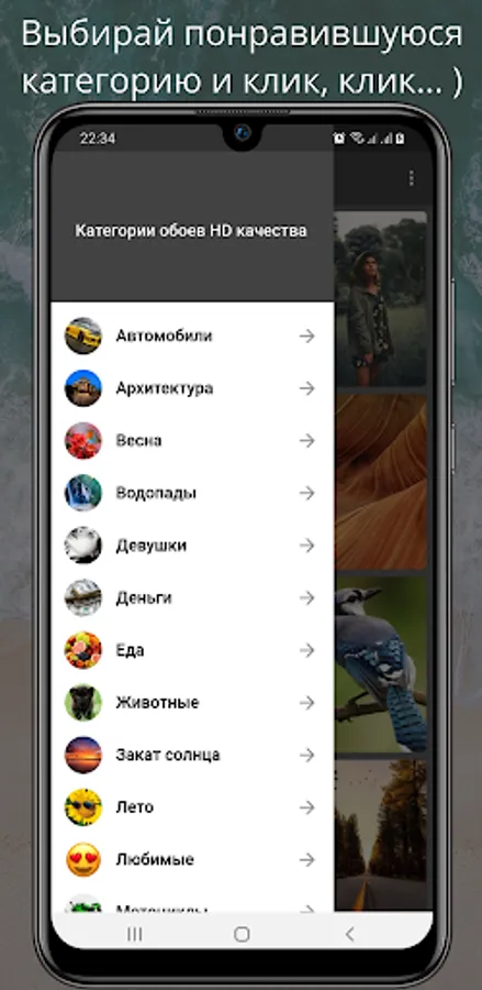After installing the application on your smartphone, you can use it. You just download cool wallpapers for your phone: beautiful landscapes, cool photos with animals, bright images of fruits and more. All pictures are of excellent quality and completely free.