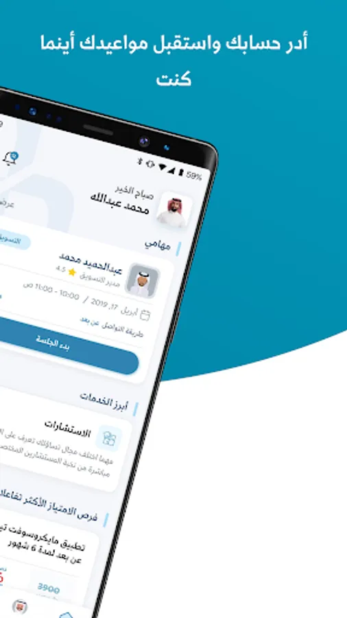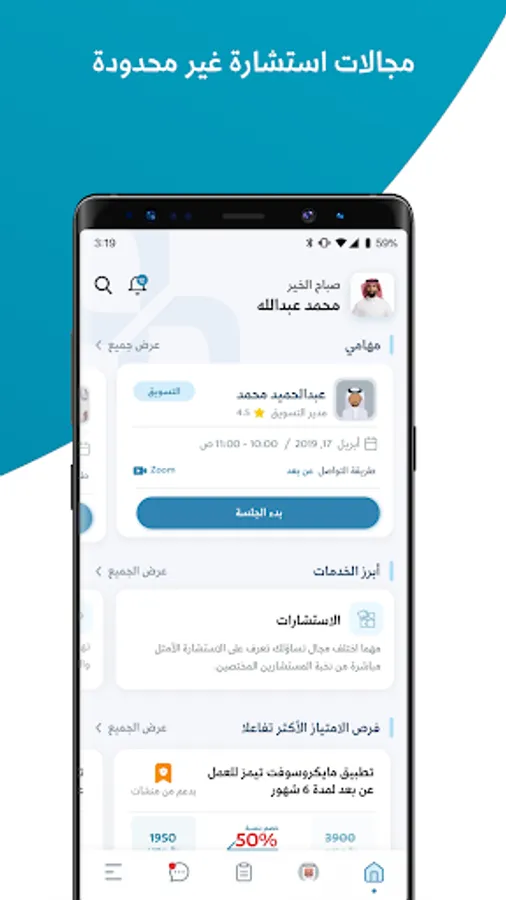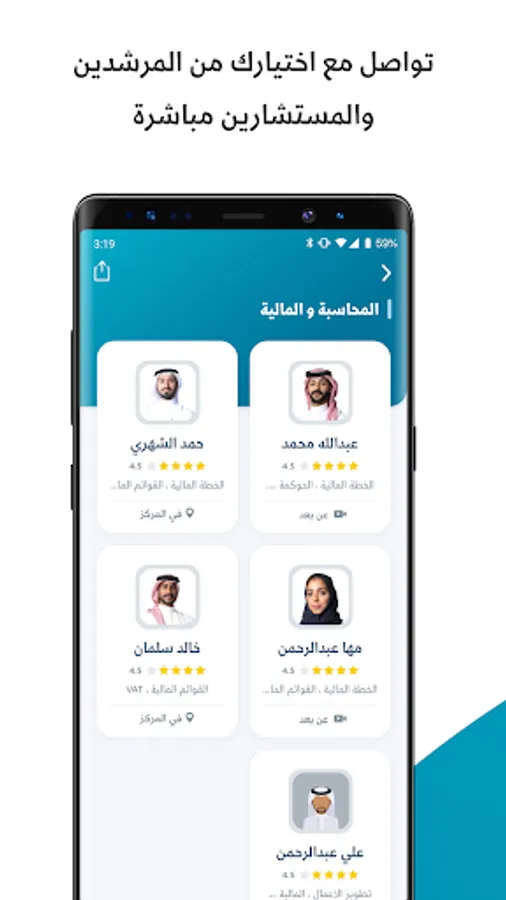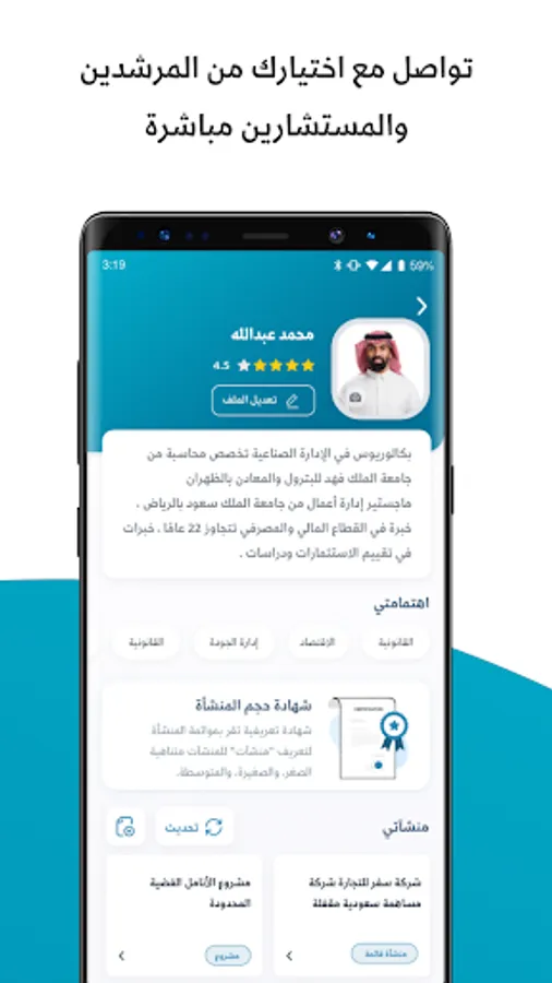 A service to provide consultations in several areas such as finance, technology, innovation, law, marketing and sales from a distance, through specialized consultants in several fields, targeting entrepreneurs and owners of small and medium enterprises through visual, audio and written communication. It is done through the application. The service aims to achieve stability and growth, overcome the challenges facing establishments, as well as reduce the rate of failure and exit from the market.