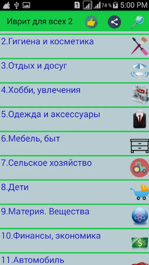The app "Hebrew for all 2" will be indispensable for everyone who begins to learn one of the most beautiful languages in the world, as well as for those who already have a basic level of knowledge. Through the application, you can learn new words for your convenience, grouped by topic.