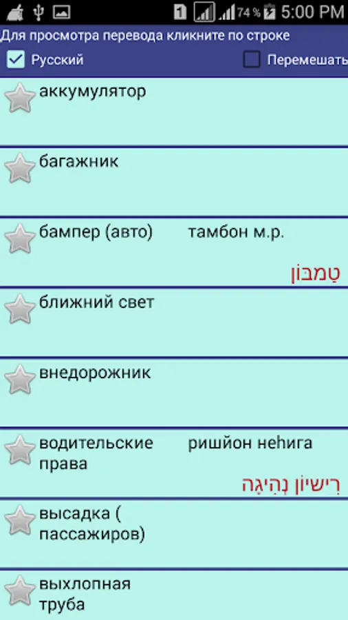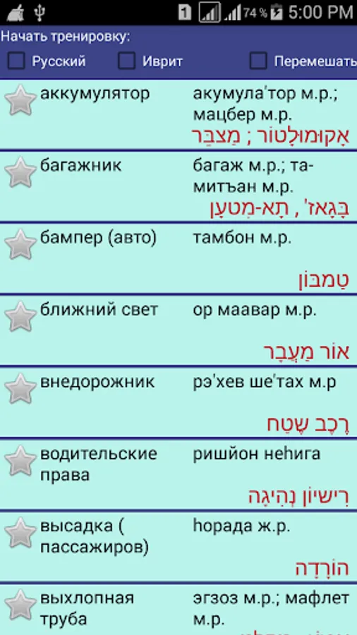 Simple and convenient workout mode. Open the topic that interests you, learn the words. When decide yourself check, set at the top mark in the "Russian" will remain only words in Russian as if in front of you a tutorial or an outline, and you hand closed translation to check yourself. You can translate a word? -Excellent, proceed to the next. You can not transfer or doubt? - Click on the line where there is the right word and the application will open the translation of the word. Similarly, place a check mark in the "Hebrew", leaving only the words in Hebrew and transliteration. Another useful feature for learning words: if you put a mark in the "Shuffle words", in the words of the topic will be displayed in a random order.