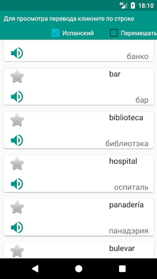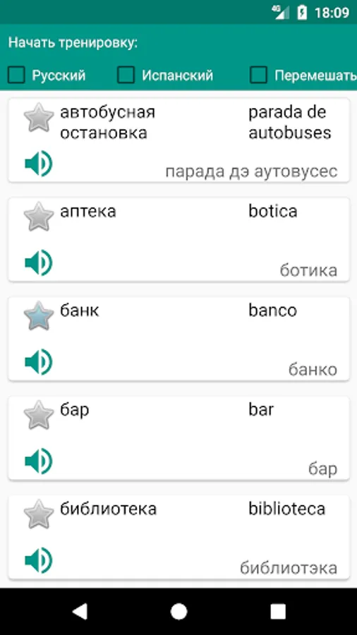 Simple and convenient workout mode. Open the topic that interests you, learn the words. When decide yourself check, set at the top mark in the "Russian" will remain only words in Russian as if in front of you a tutorial or an outline, and you hand closed translation to check yourself. You can translate a word? -Excellent, proceed to the next. You can not transfer or doubt? - Click on the line where there is the right word and the application will open the translation of the word. Similarly, place a check mark in the "Spanish" - remain just words in Spanish and transcription. Another useful feature for learning words: if you put a mark in the "Shuffle" field, in the words of the topic will be displayed in a random order.