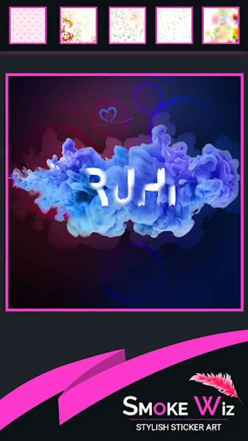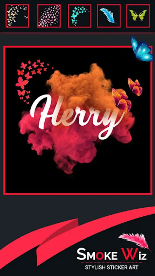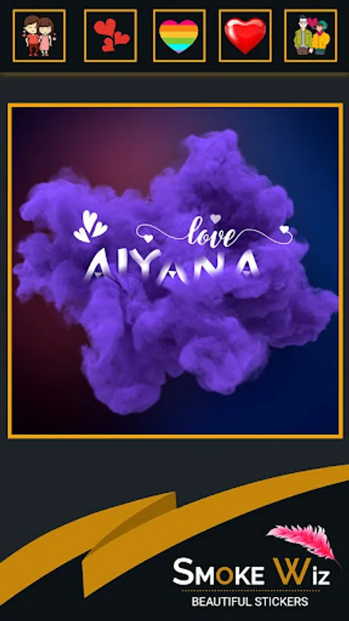 Text you can choose your love font, color, edit size text, drag, rotate your text. Smoke Effect Name - Art that you can decorate it with different decorative item as feathers, love items, art item, love stickers, color brush, color filter, heart shapes.