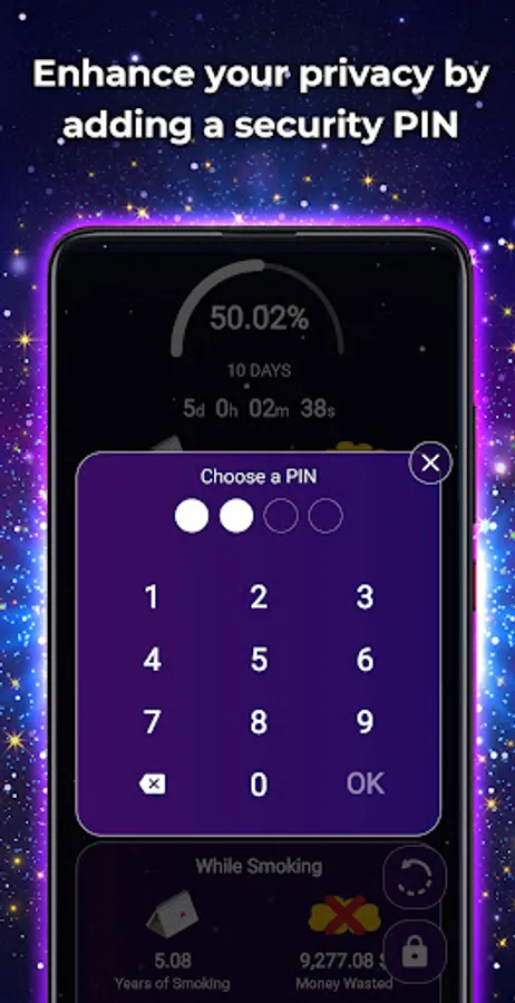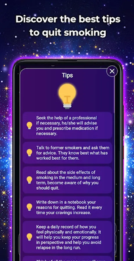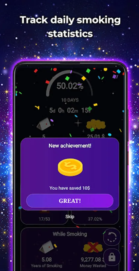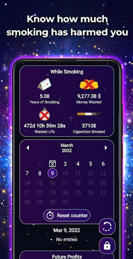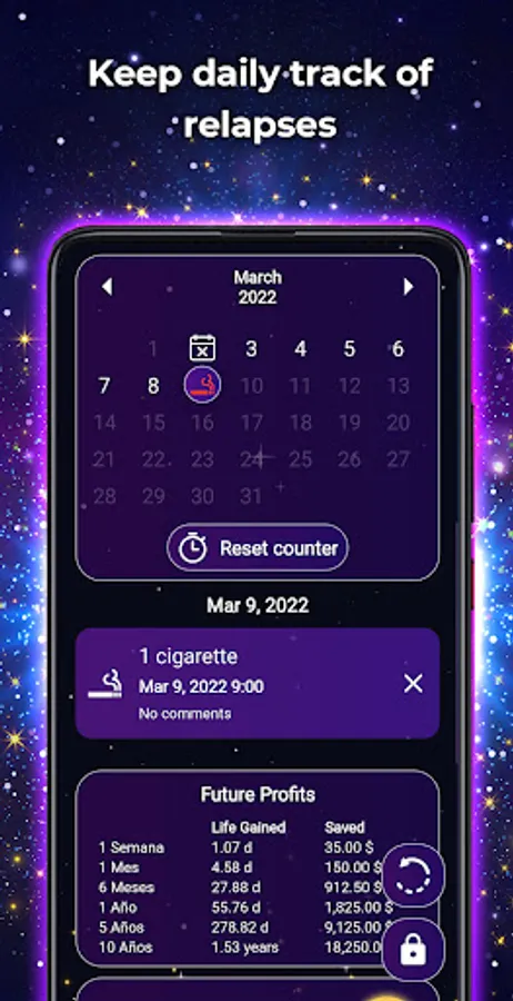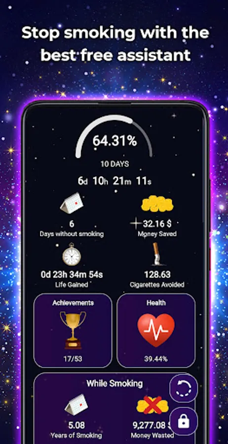 - Money saved: See second by second the money you have saved by quitting smoking.