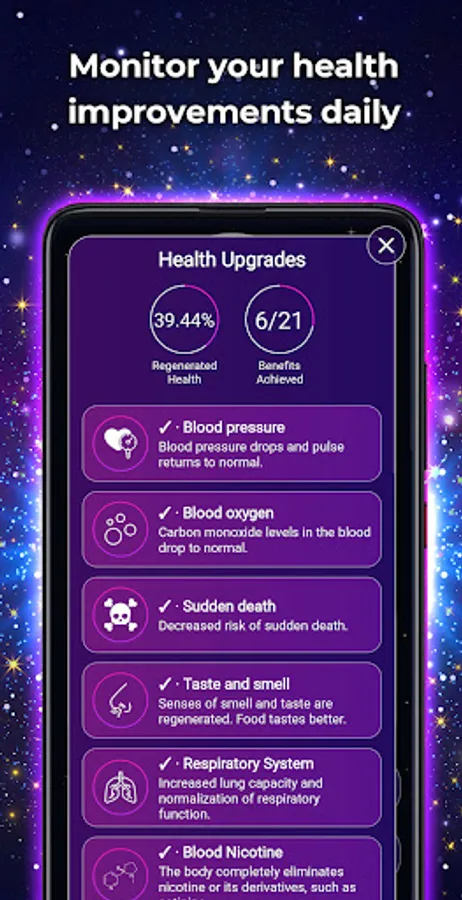 In this section you can see your progress and health improvements, from normalizing your blood pressure to eliminating nicotine from your body. Keeping track of your health improvements will make it more difficult for you to relapse.