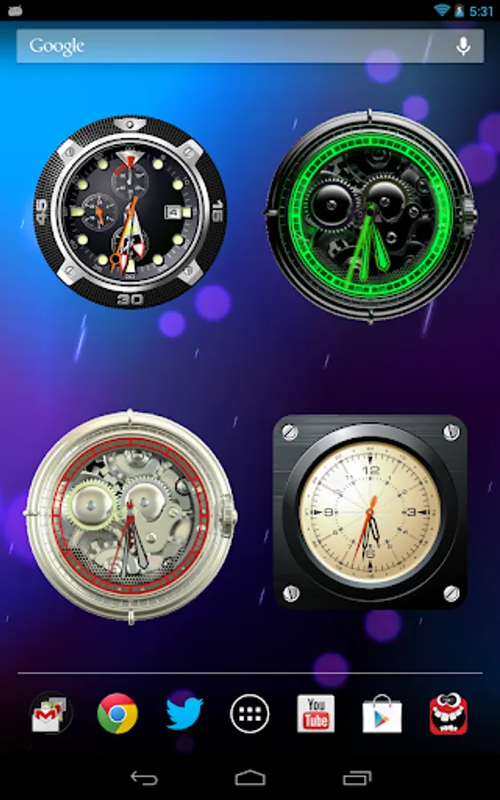 We are proudly presenting first, fully animated Analog Clock Live Wallpaper and Widget Collection on Android. Live Wallpaper or Widget with animated clock mechanism includes moving gears, coils and second hand looking beautiful and stunning on your device. With amazing photo-realistic HD quality, specially built for latest HD phones and tablets, Analog Clock Widgets will make your eyes glare.