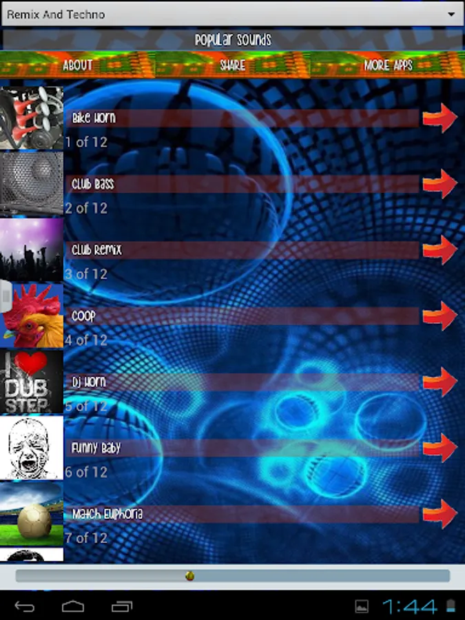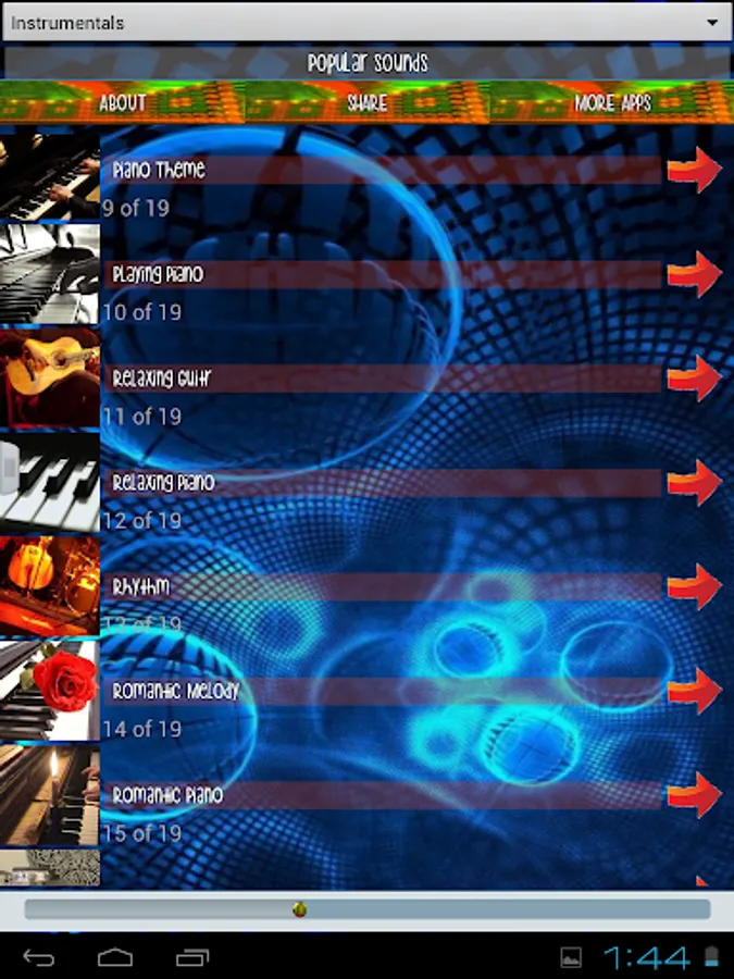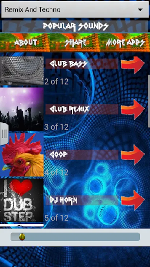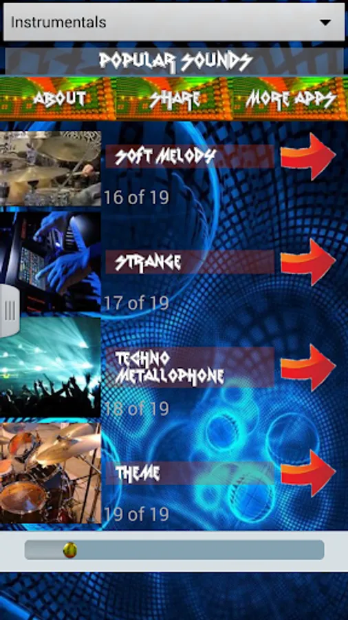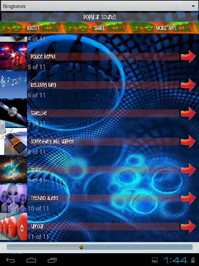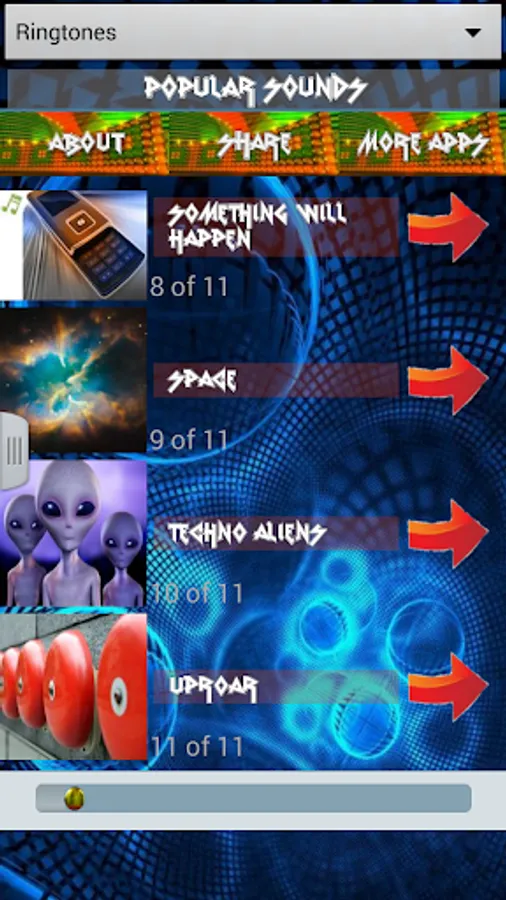 ★ To listen to the most popular ringtones, simply click on the image button. Options for using music sound as ringtone, notification or for alarm tone are on the red arrow on the right side. On the top of the screen you can find categories menu and choose type of the popular ringtones that you would like to check out. Volume control is on the bottom of the screen, so you can control sound directly from the app. If you would like to share this app with a friends, you can to that very easily with the middle button "share" on the top of the screen, and you will be offered to share app with everything that your android device is able to use for sharing.
