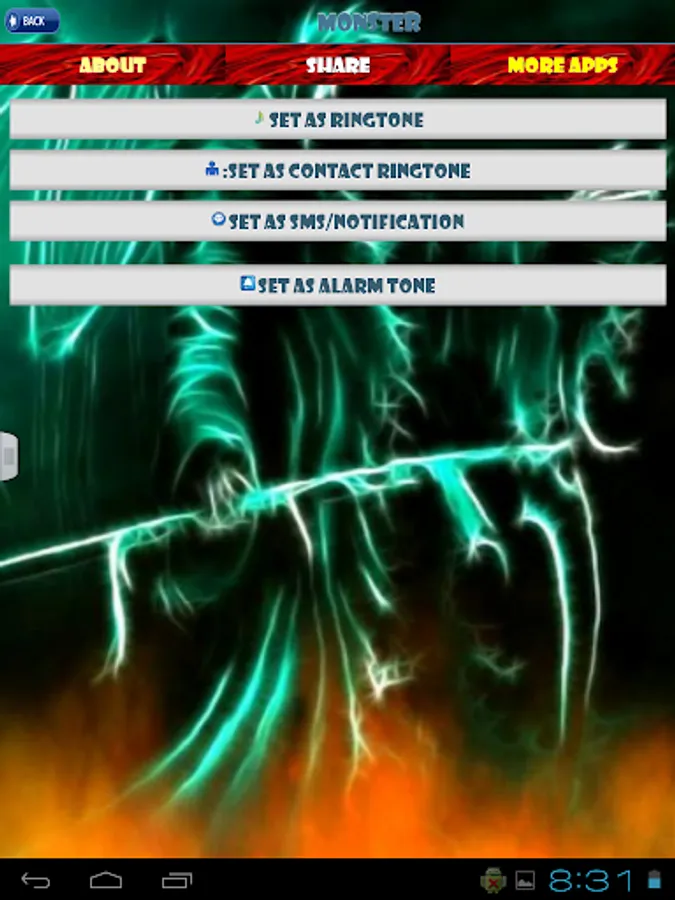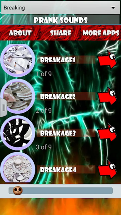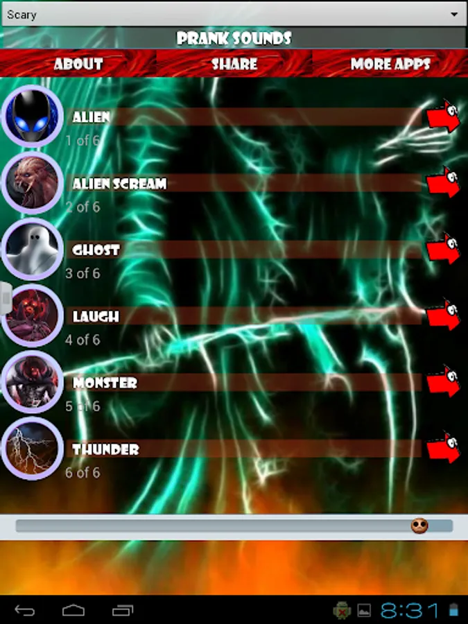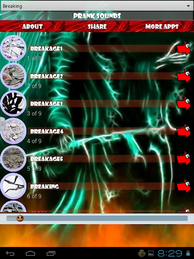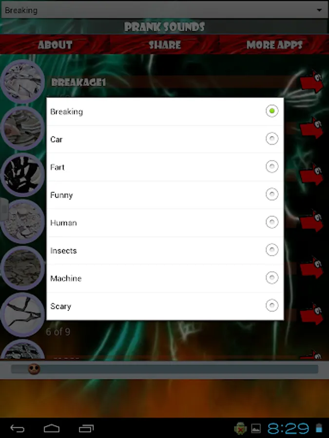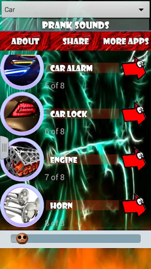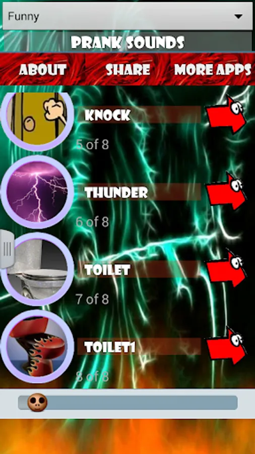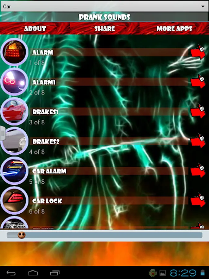 ★ To listen to the sound, simply click on the image button. Options for using sound as ringtone, notification or for alarm sound are on the red arrow on the right side. On the top of the screen you can find prank sounds menu and choose prank section that you would like to explore. Volume control is on the bottom of the screen, so you can control sound directly from the app. If you would like to share this app with a friends, you can to that very easily with the middle button "SHARE" on the top of the screen, and you will be offered to share app with everything that your android device is able to use for sharing.