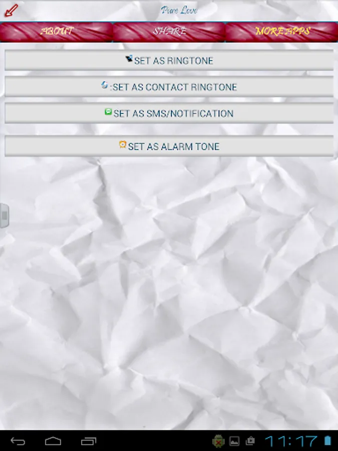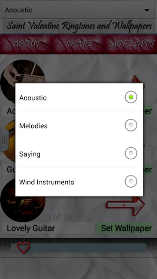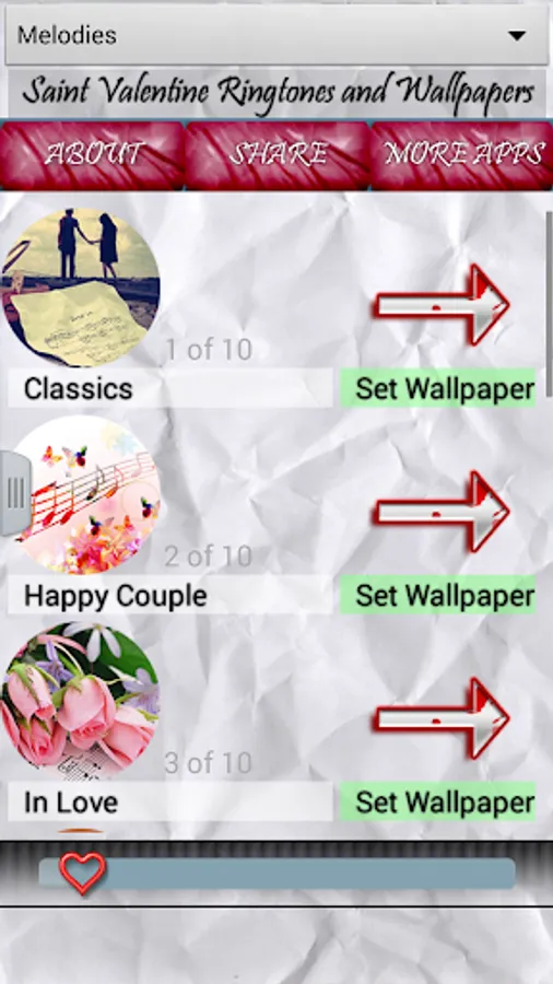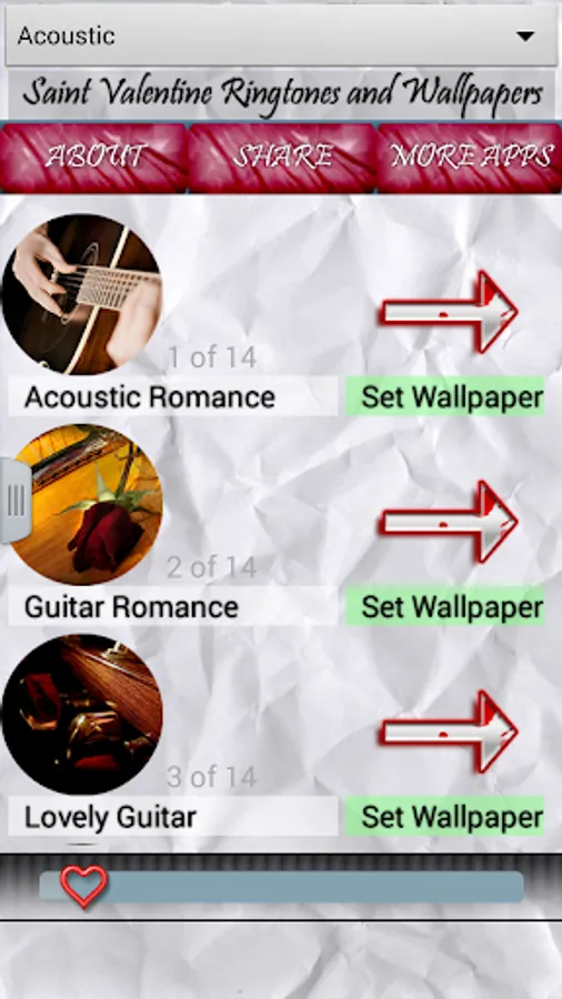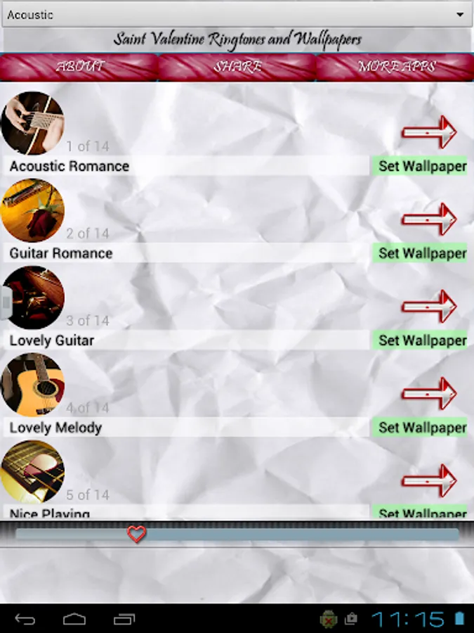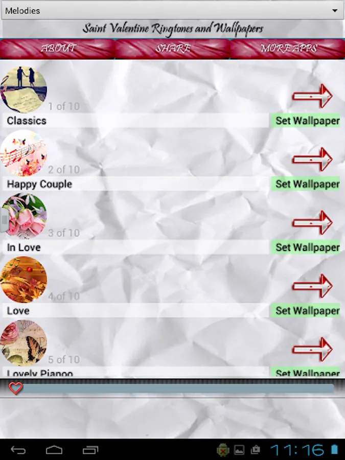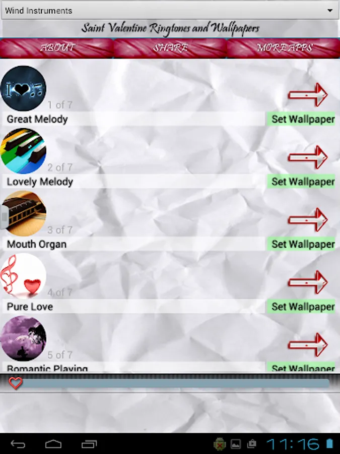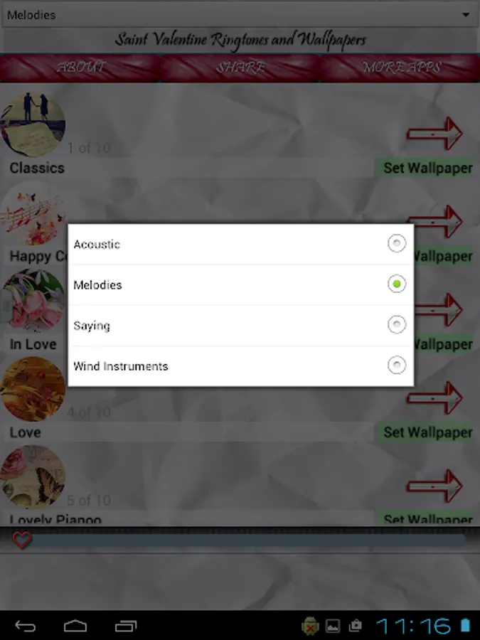 Share wonderful love moments with your loving partner and fulfil them with our fantastic app. Choose one of romantic melodies and use it for you love as contact ringtone, or for default ringtone and let everybody know how are you feeling. You can also play a sound when you are alone with your better half and tell something beautiful to her, that will have much bigger impact on her, than just to be told in quiet, and your partner will remember it for ever!. You can choose from amazing acoustic guitars through fantastic violin melodies. Also we have special section for notification sounds with "I love you" sounds. Each sound contains amazing romantic wallpaper that you can use for your background image, to remind you of something special every time you look at your device.