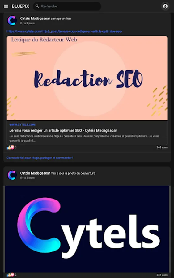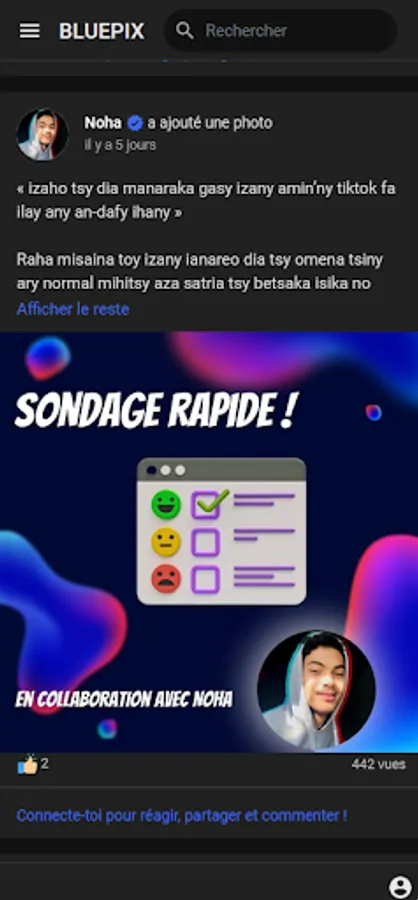 BluePix is a social network created by malagasys for malagasys that allows young people to communicate and share information, ideas, points of view and common interests. It can be used to keep in touch with friends and family members, to meet new people, to share photos, videos and other content, to participate in online groups and communities, and to discover content and events based on their interests.