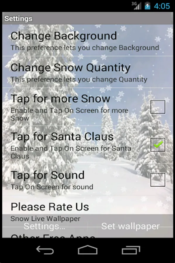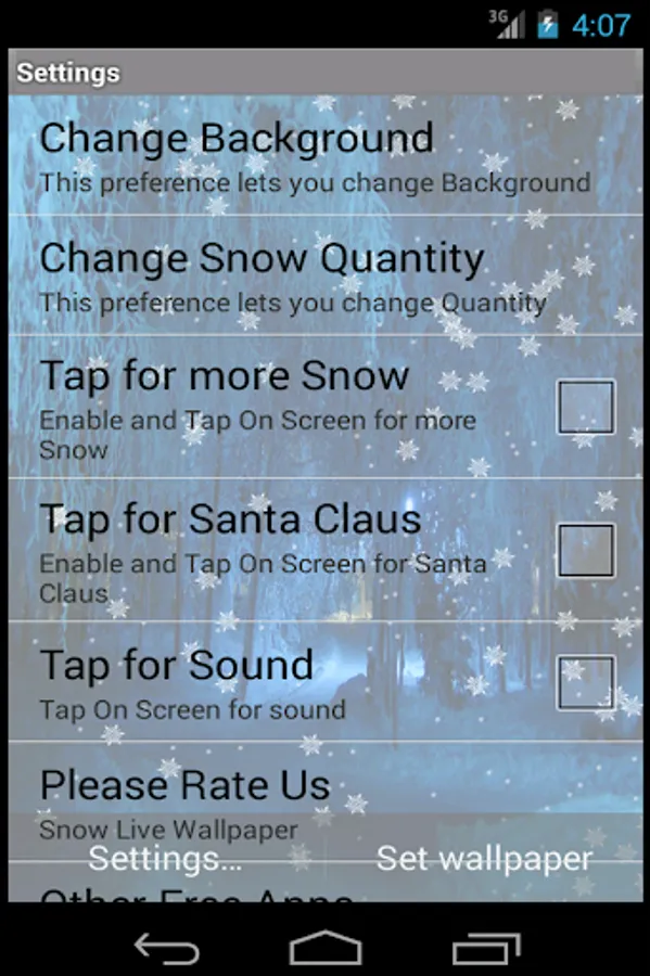 If you love “winter” or “snow” ,probably you will love this beautiful application. it has a full settings screen with lots of options for Christmas, and more!