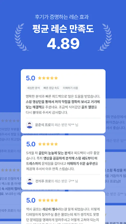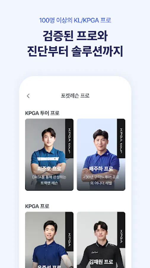Get lessons from several pros with one swing video, and find a pro that suits you well! From KPGA Tour pros to G-tour pros, various verified pros are waiting for you.