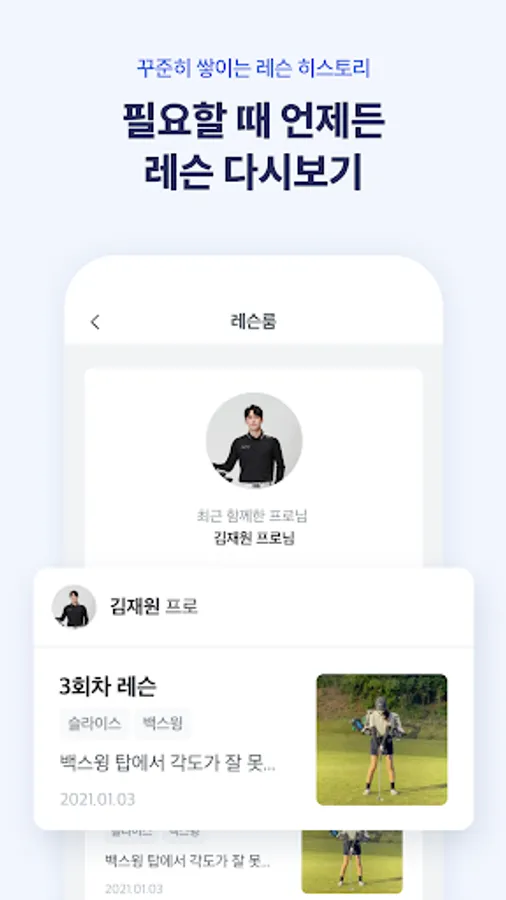The lessons I received are accumulated in the [Lesson Room]. Revisit the lesson and review it whenever you need to. I can see with my own eyes that my swing is getting better.