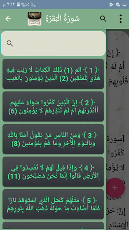 ◉ A side menu containing all the verses of the surah for quick presentation and transition between them.