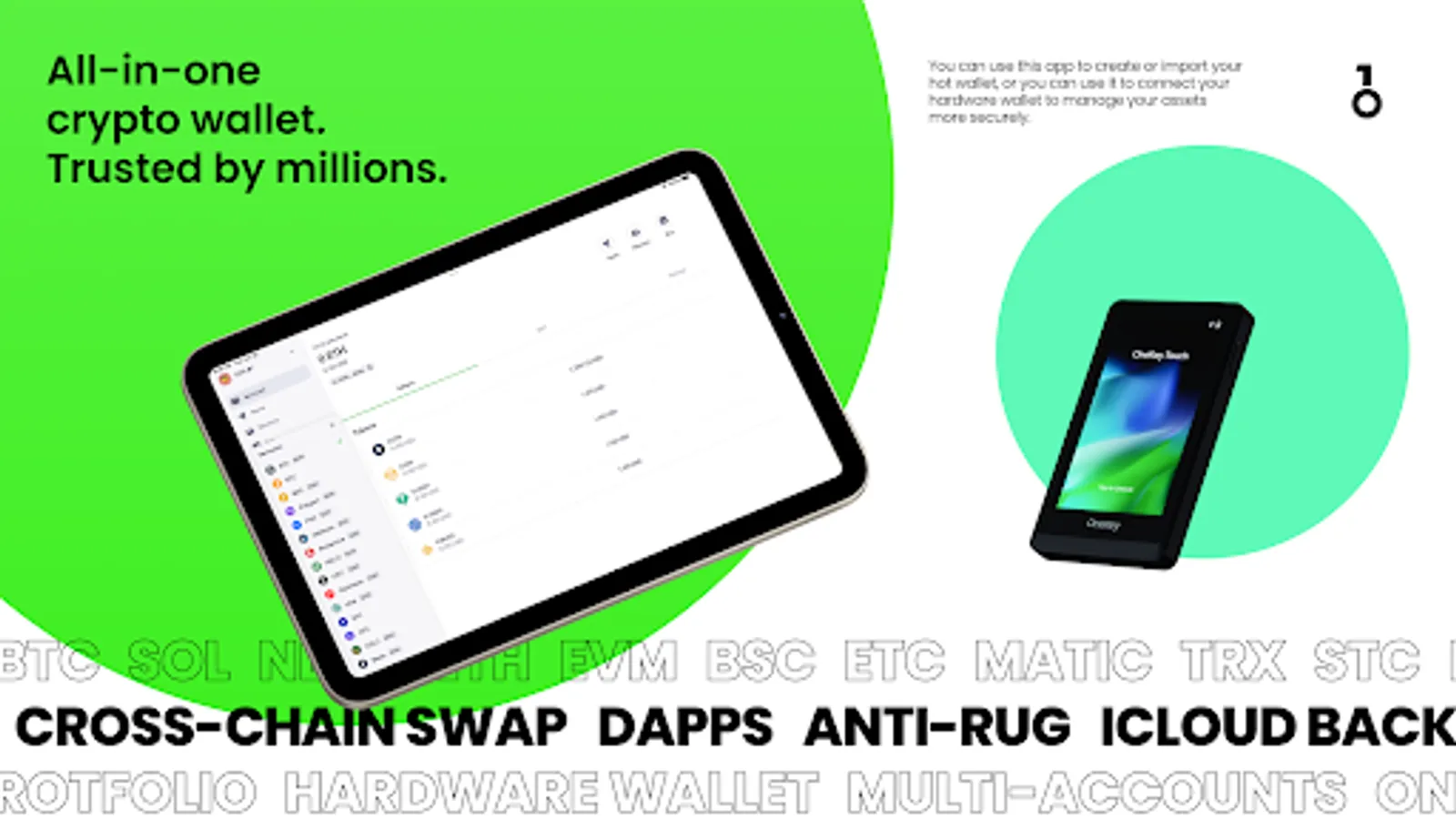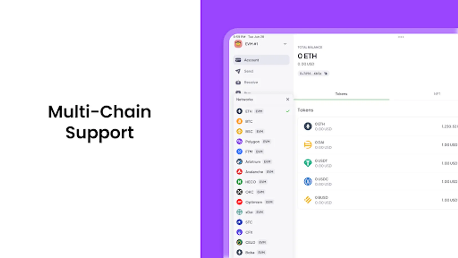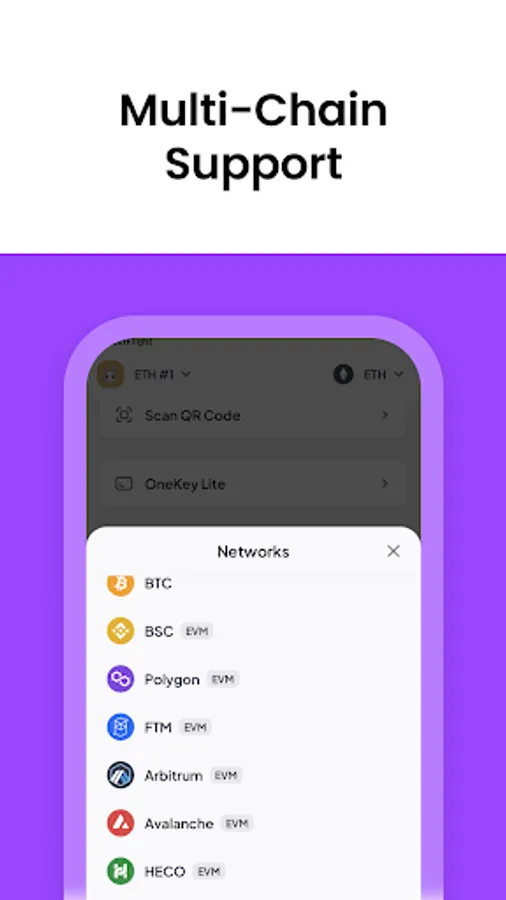 BTC, Lightning Network, Solana, Aptos, Near, STC, DOGE, LTC, Tron, EVM Chains (BSC, ETH, Arbitrum, Avalanche, Optimism, Polygon, CELO, CRO, FTM, HECO, OEC, xDai, and customized EVM Network).