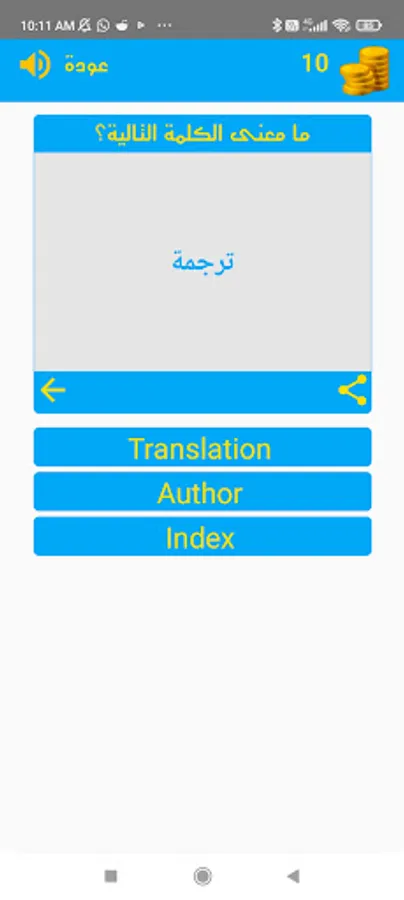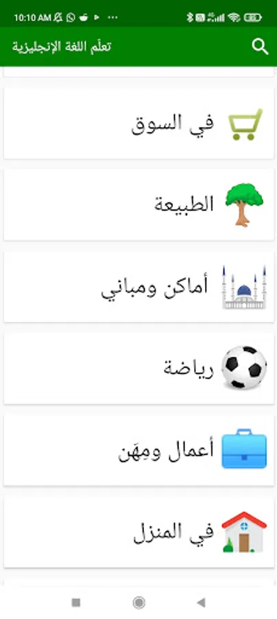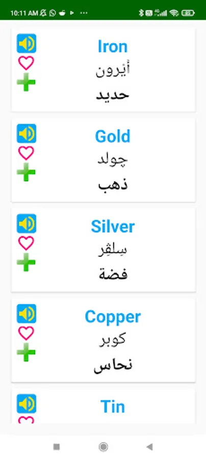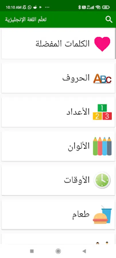 Each word is written in the English language and also written in the Arabic language so that it helps the user to know how to pronounce the word or sentence