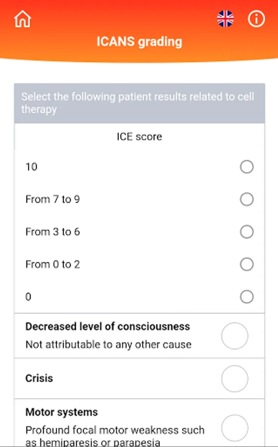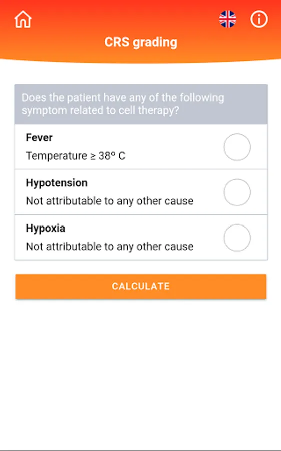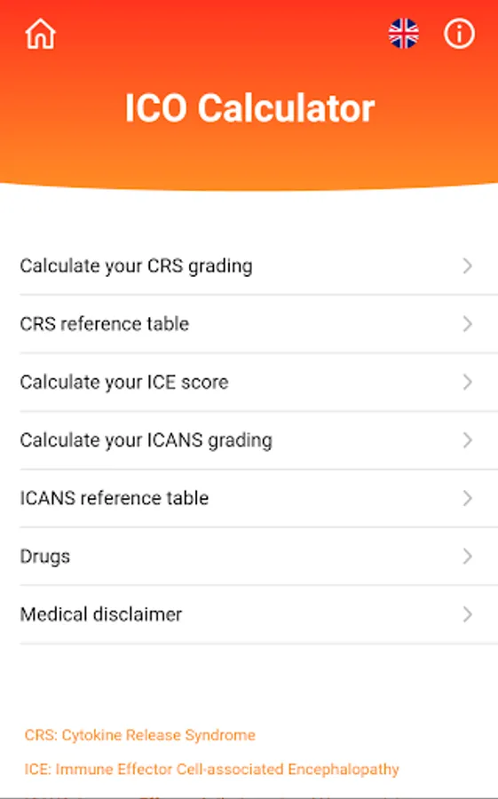 The aim of this calculator is to offer a bedside resource for all physicians involved into the clinical care of oncological and hematological patients. The number of prognostic scores or medical calculators required during the daily medical activity is constantly increasing. For example, it is important to facilitate the scoring of acute complication such as cytokine release syndrome or neurotoxicity. Grading scores of cytokine release syndrome, immune effector cells neurotoxicity syndrome (ICANS) and Immune Effector Cell-associated Encephalopathy (ICE) of the American Society for Transplantation and Cellular Therapy are available here. Also, suggested therapies related to the severity of the symptoms are reported. Thanks to this calculator, physicians and nurses will have a bedside tool to perform real-time assessments of oncological patients receiving immunotherapies. Newer calculators related to the oncological setting will be added in the next future. The available languages are Spanish and Catalan.