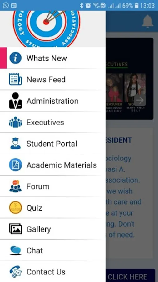 An all in one encompassing android app that permits members of the Sociology Students Association to access their academic portal as well as necessary updates and news from the association and again get help if necessary. The resources ranges from a forum, private messaging with instant feedback, access to student portal, notifications, contact, news and events, executives, gallery among many others
