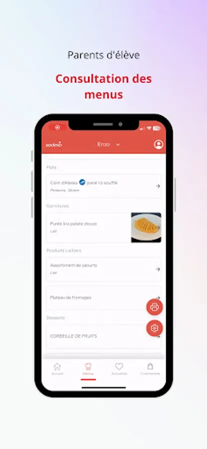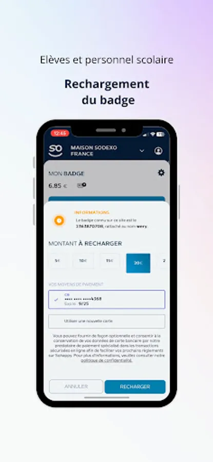 Employees, high school and university students, consult the menus of your catering areas with the details of the recipes (photos, nutritional values, allergens), recharge your badge, check your balance and be alerted in the event of a low balance.