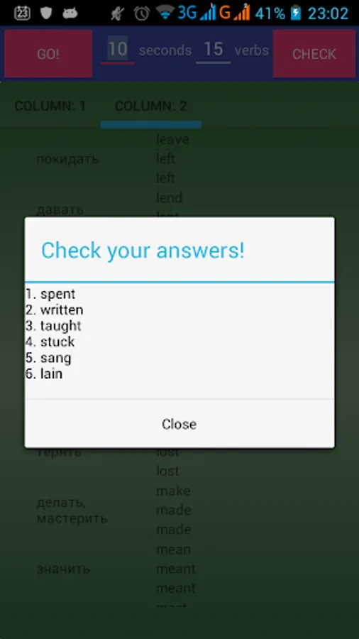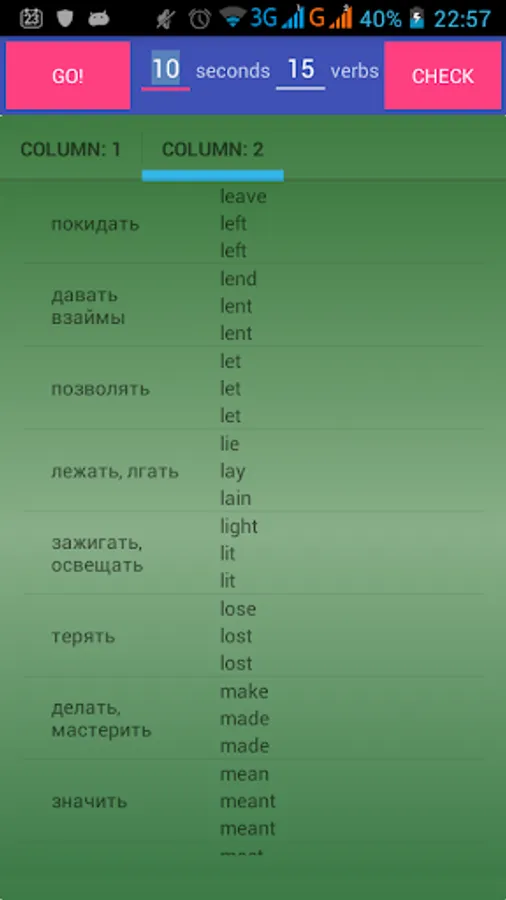 The mobile device dictates with a synthesized voice in random order with a given time interval the verbs and the number of its form. You can record your answers on paper and check with the correct answers at the end.