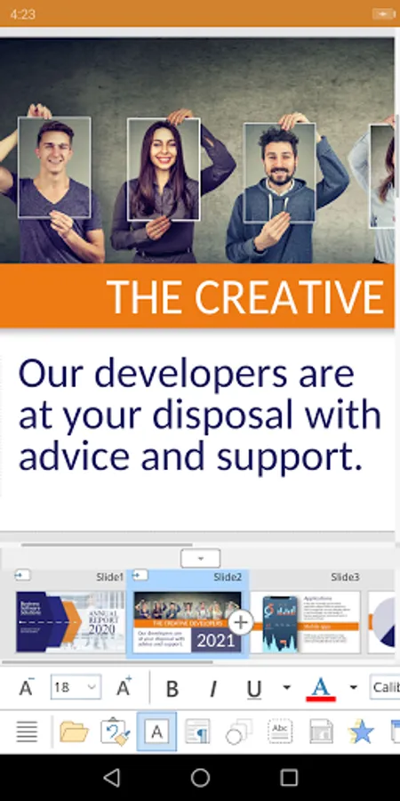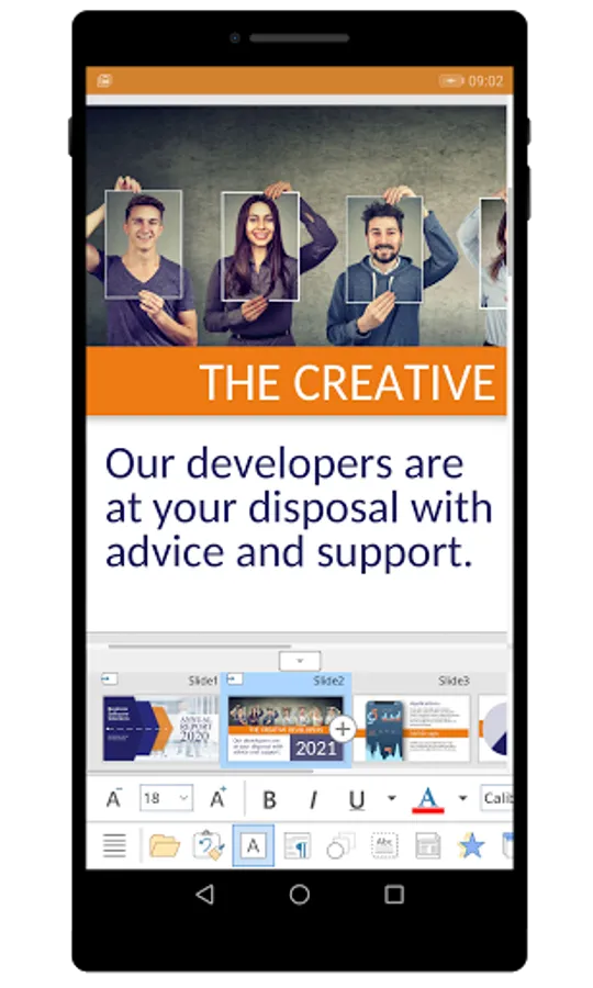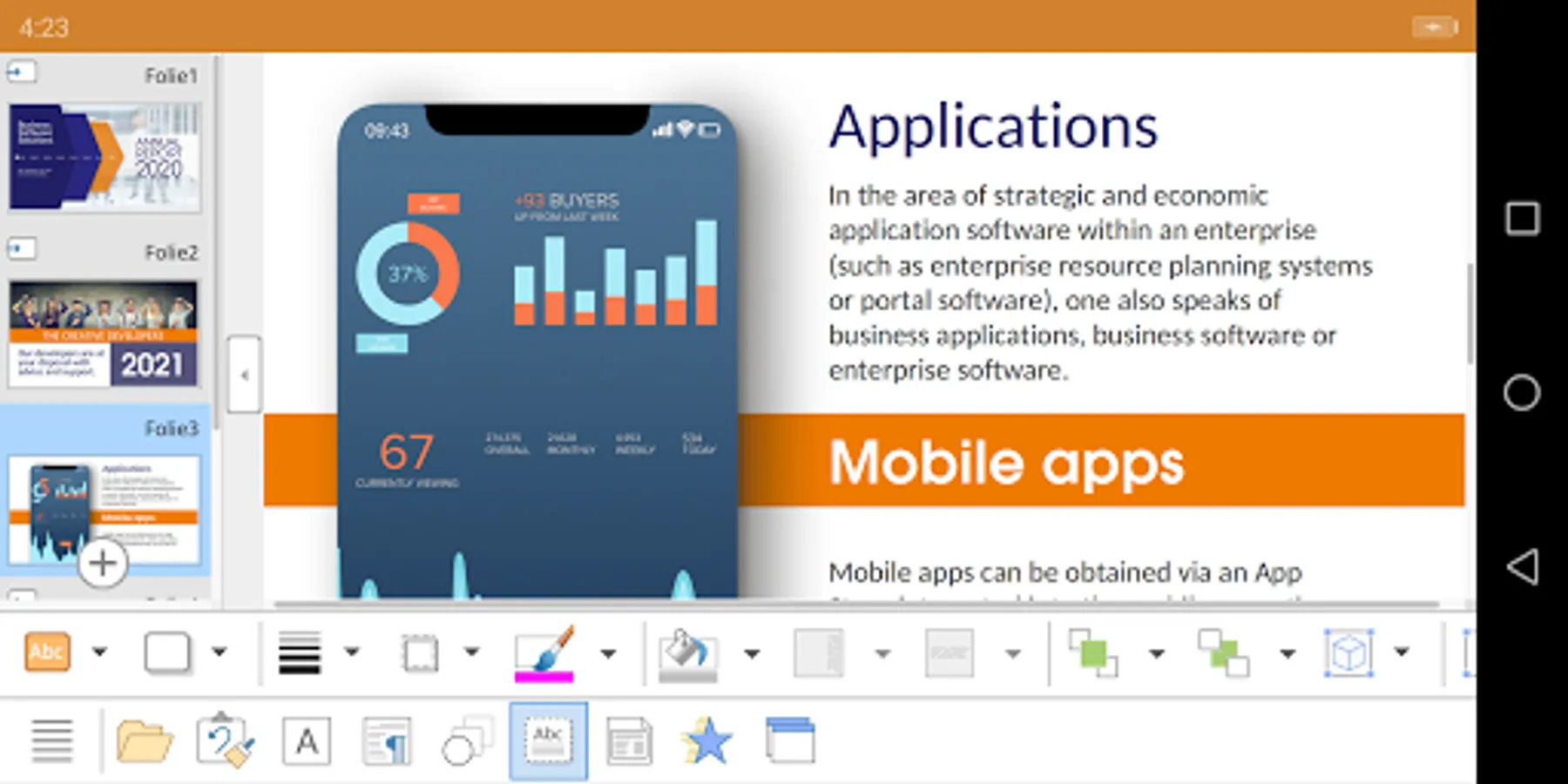 Intuitive operation on smartphones and tablets: Presentations always provides an ideal user experience, regardless of whether you're using it on your smartphone or a tablet. On a phone, you can use the practical toolbars with just one finger. On your tablet, you work with ribbons similar to those on your PC.