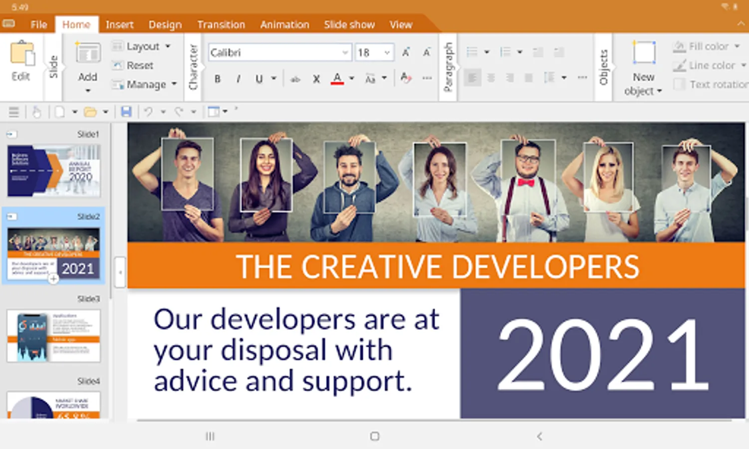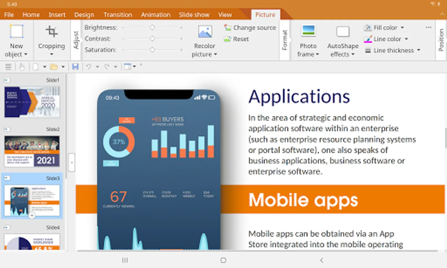 The complete set of features that you know from Microsoft PowerPoint or Presentations on your PC is now offered by Presentations on your smartphone and tablet.