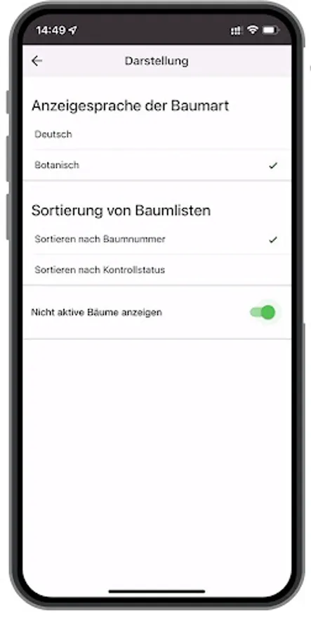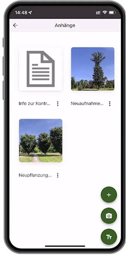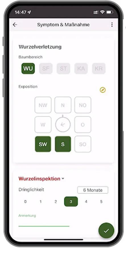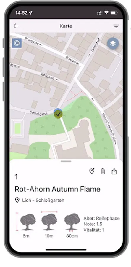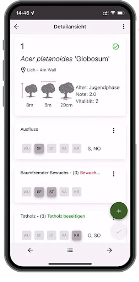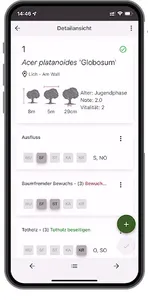 The inventory of trees is recorded with just a few taps of the finger. Any number of documents, notes and photos can be stored for each tree.