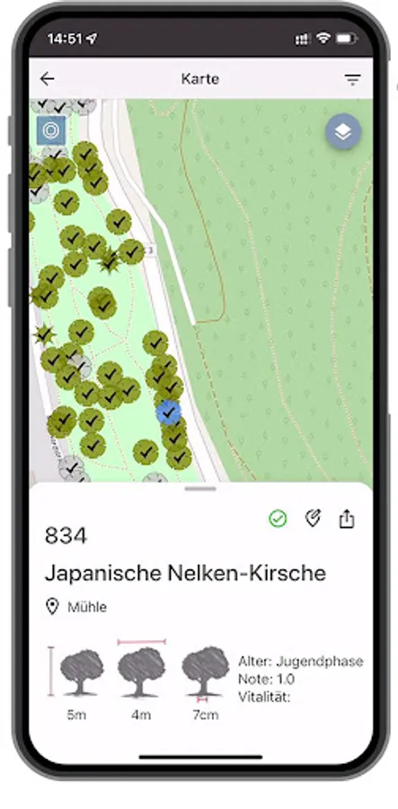 The integrated map display offers indispensable help for orientation in the tree population and for later finding of the trees by the maintenance companies carrying out the work.