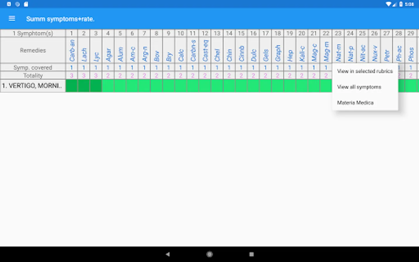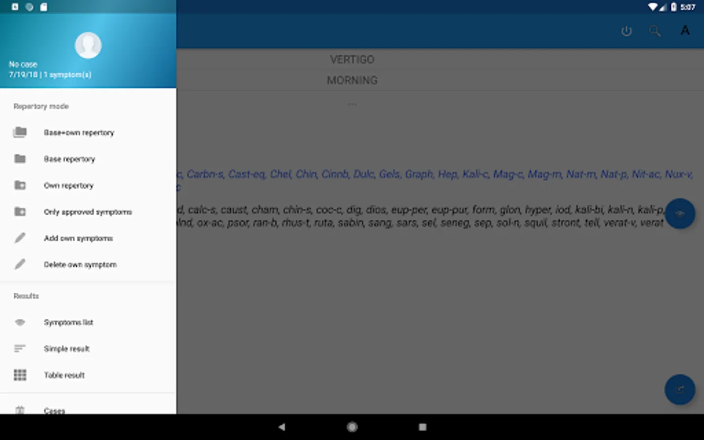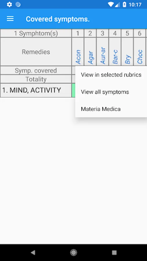 The app contains a homeopathic repertory of 73695 symptoms, which you are familiar with using the Homeopathic Repertory app and Materia Medica, in which 1118 preparations are described. Results of repertorization are presented in the form of a list of remedies or as a table. The results can be sorted by 3 algorithms: covered symptoms, the grade of remedies and the sum of these values.
